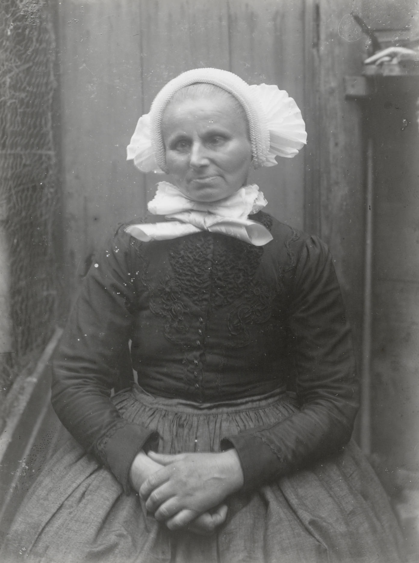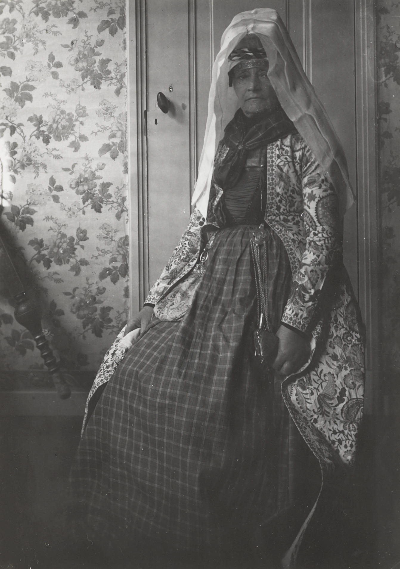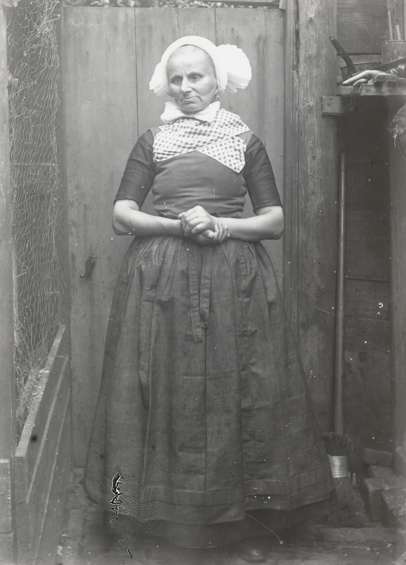 Vrouw in Urker dracht, circa 1916 (zwart-wit foto)