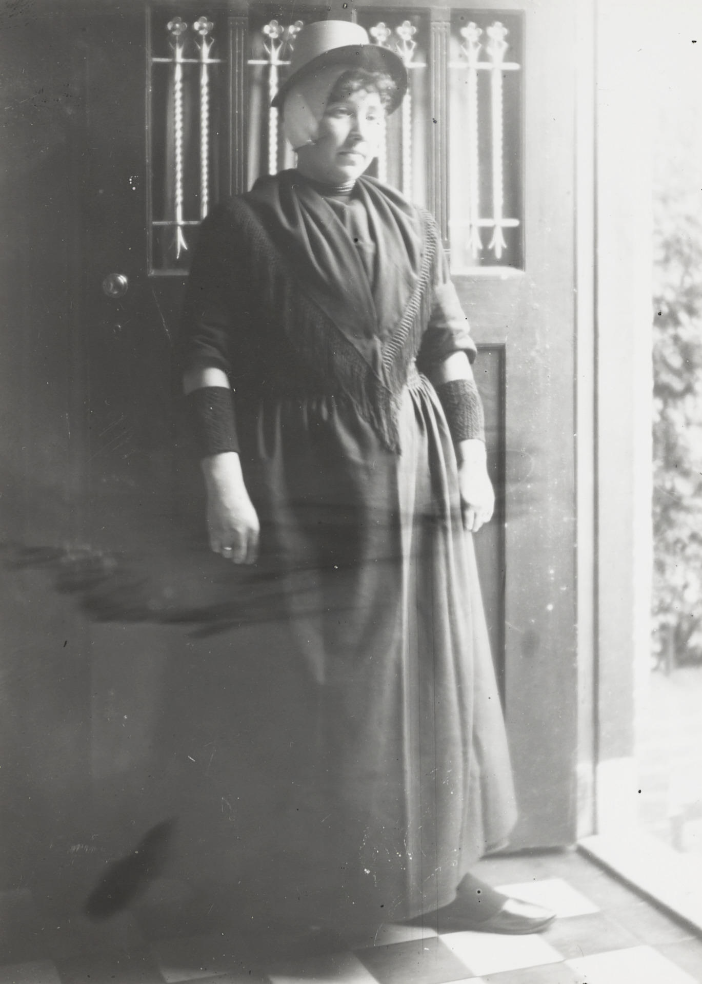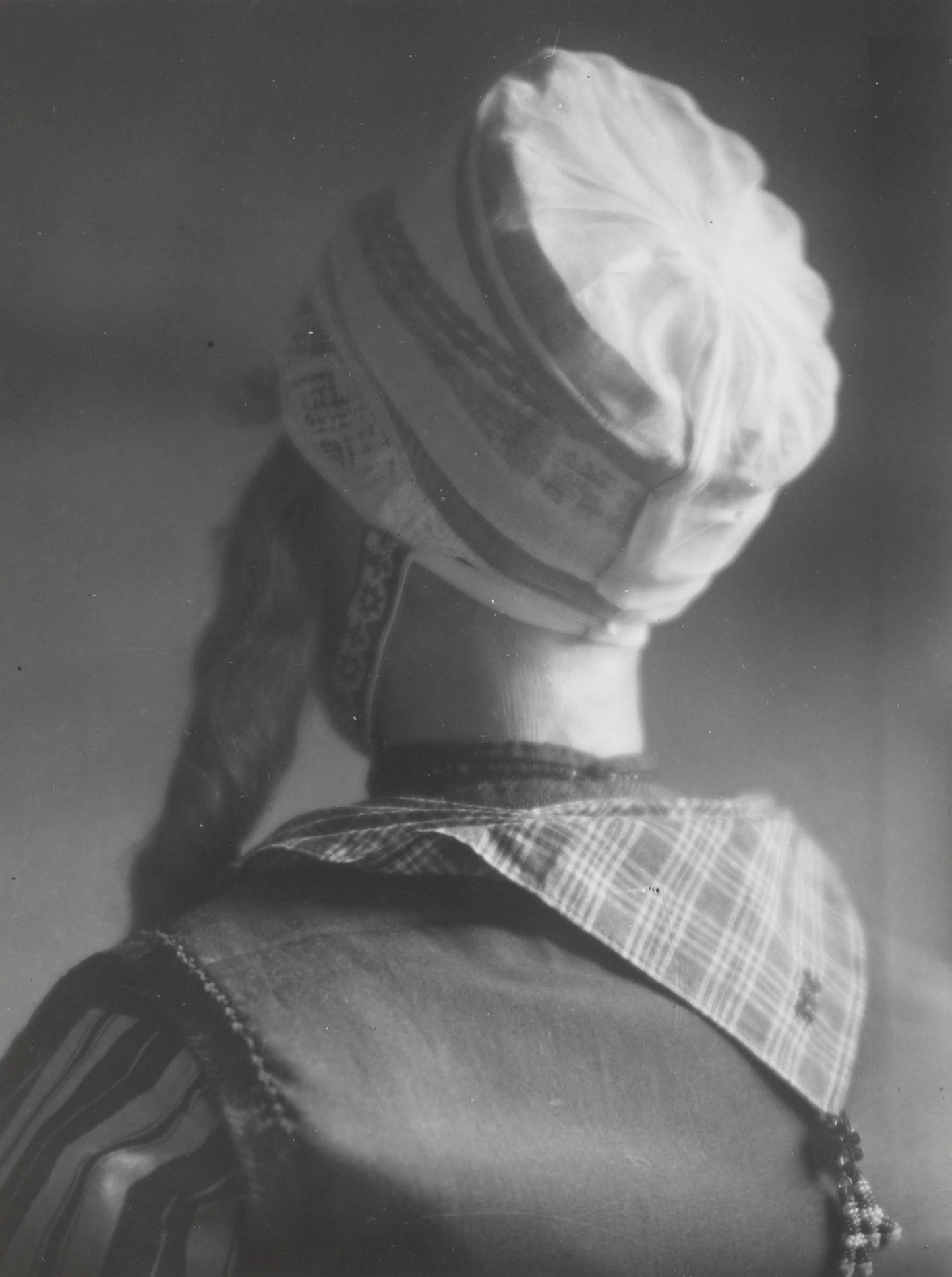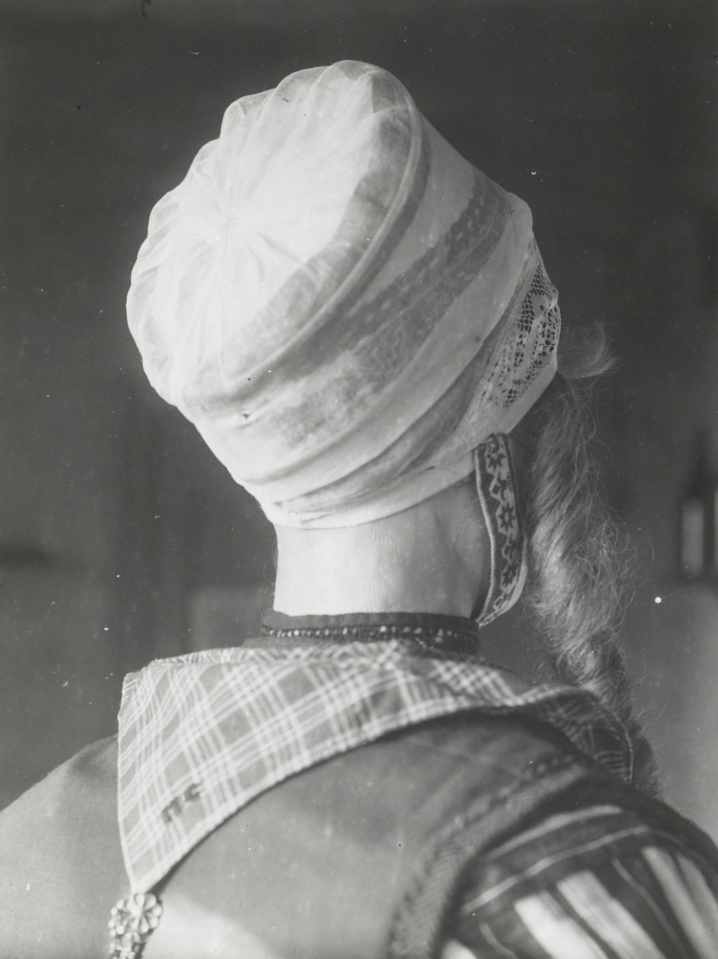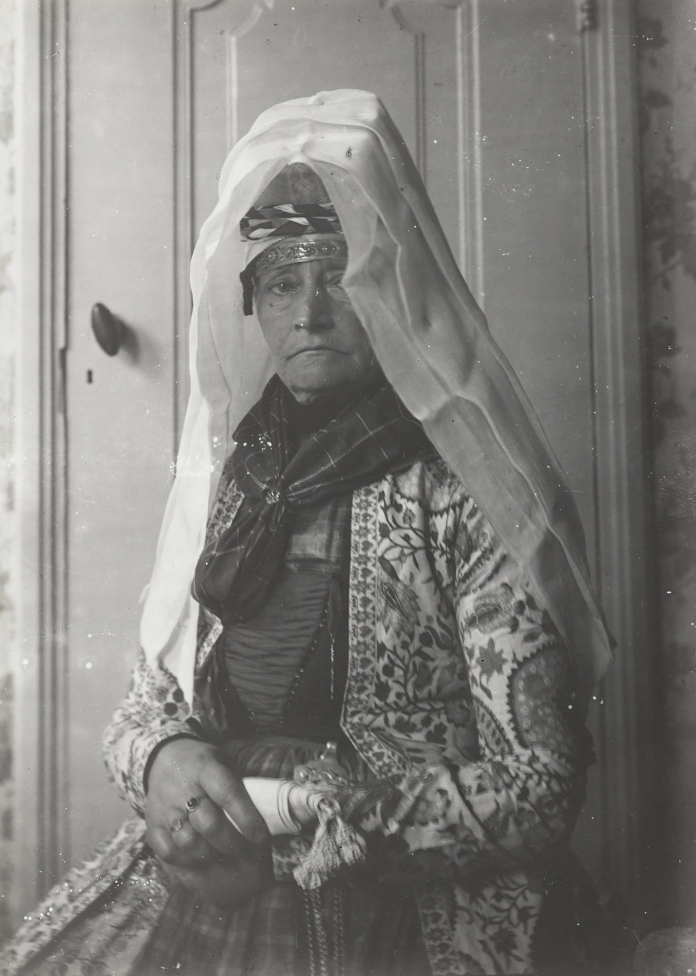Vrouw in Urker dracht, circa 1916 (zwart-wit foto)