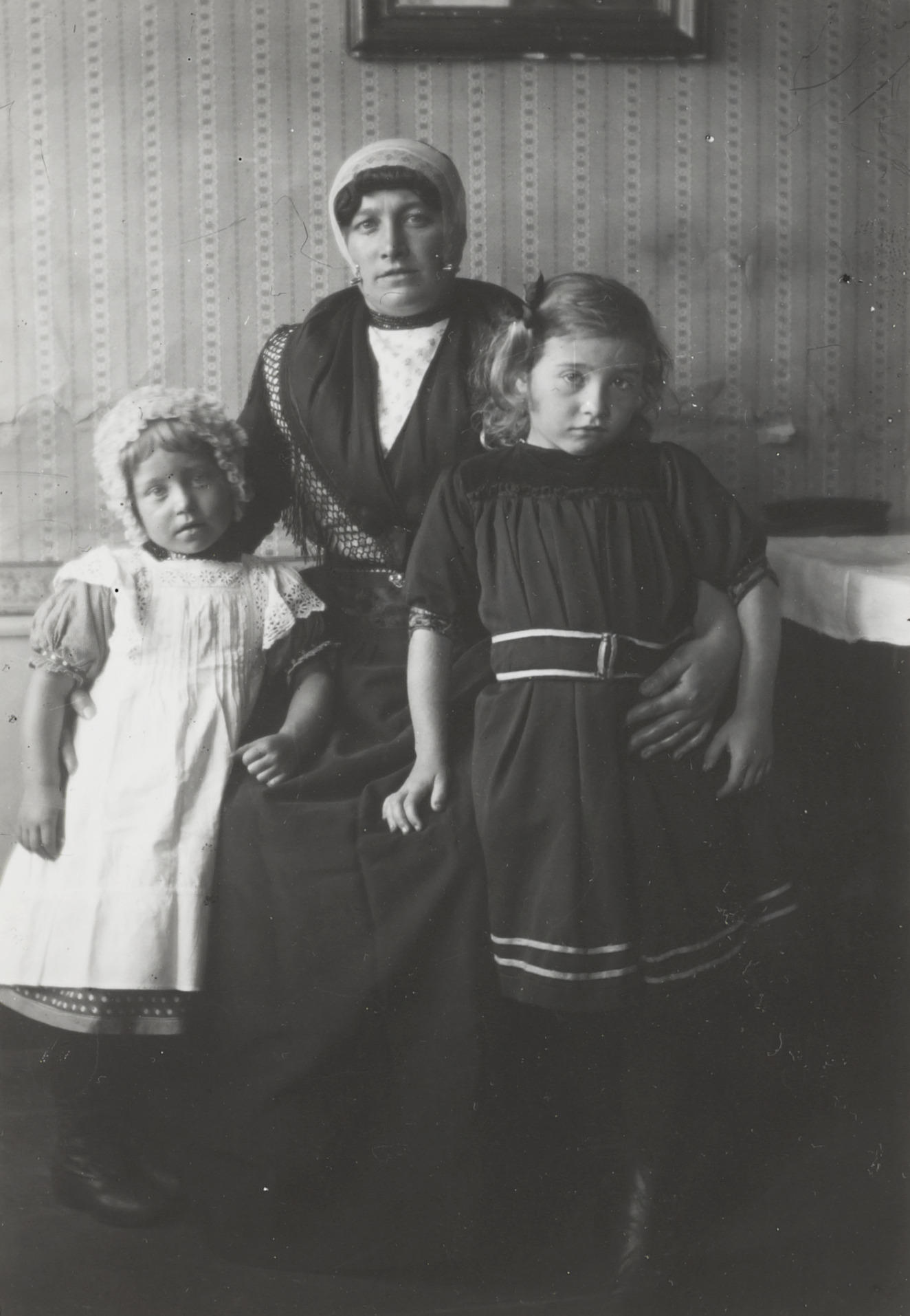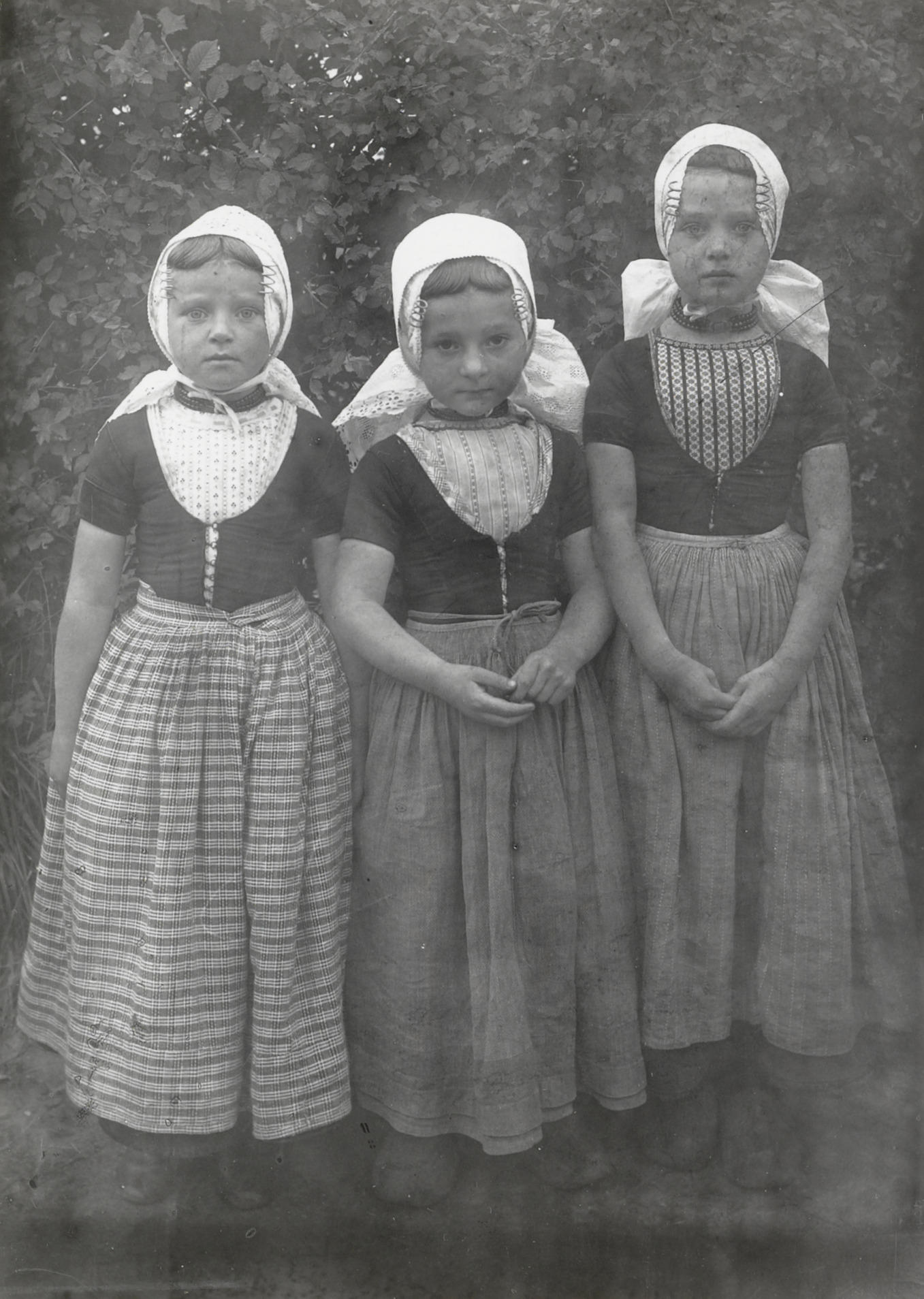 Drie meisjes in Walcherse dracht, 1913–1916 (zwart-w...