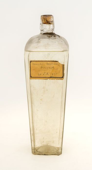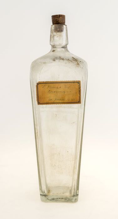 Doorzichtige fles met op etiket geschreven "... / Br...