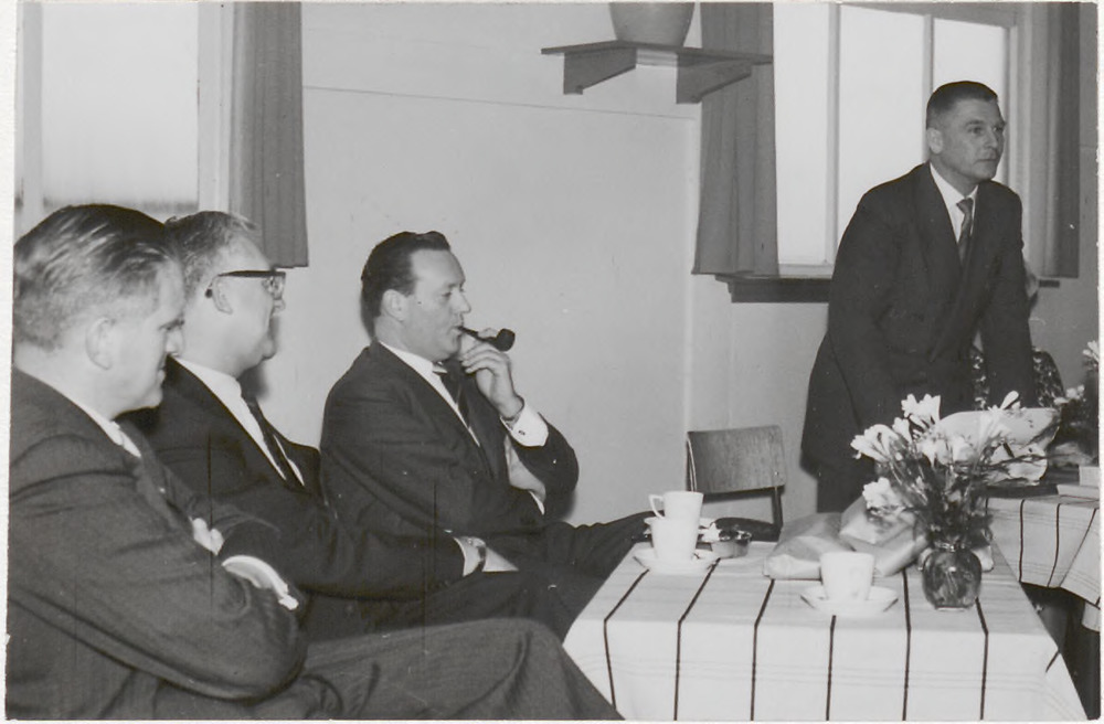 Foto van vier mannen in een vergaderzaal, één van he...