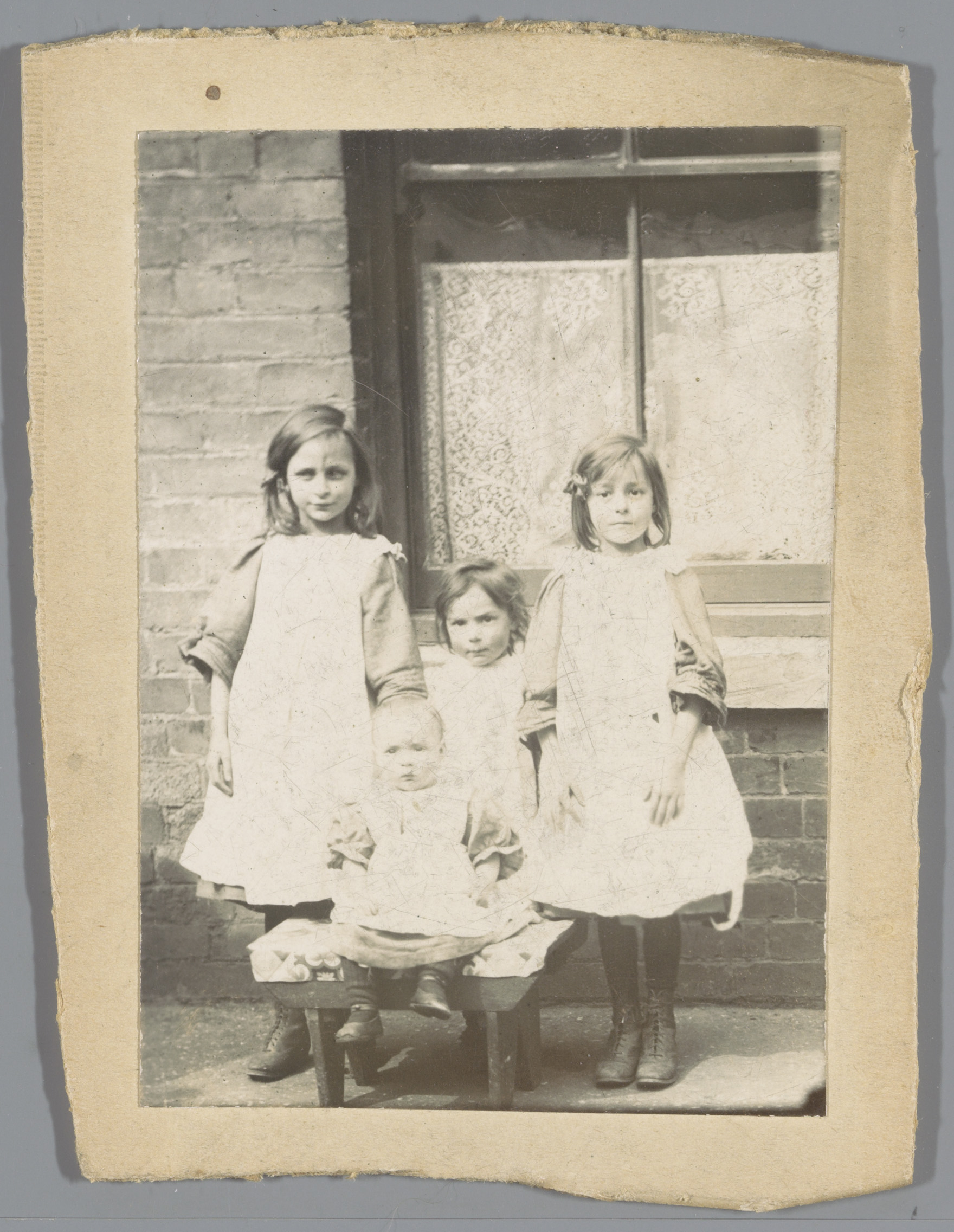 Portret van vier onbekende kinderen voor een huis