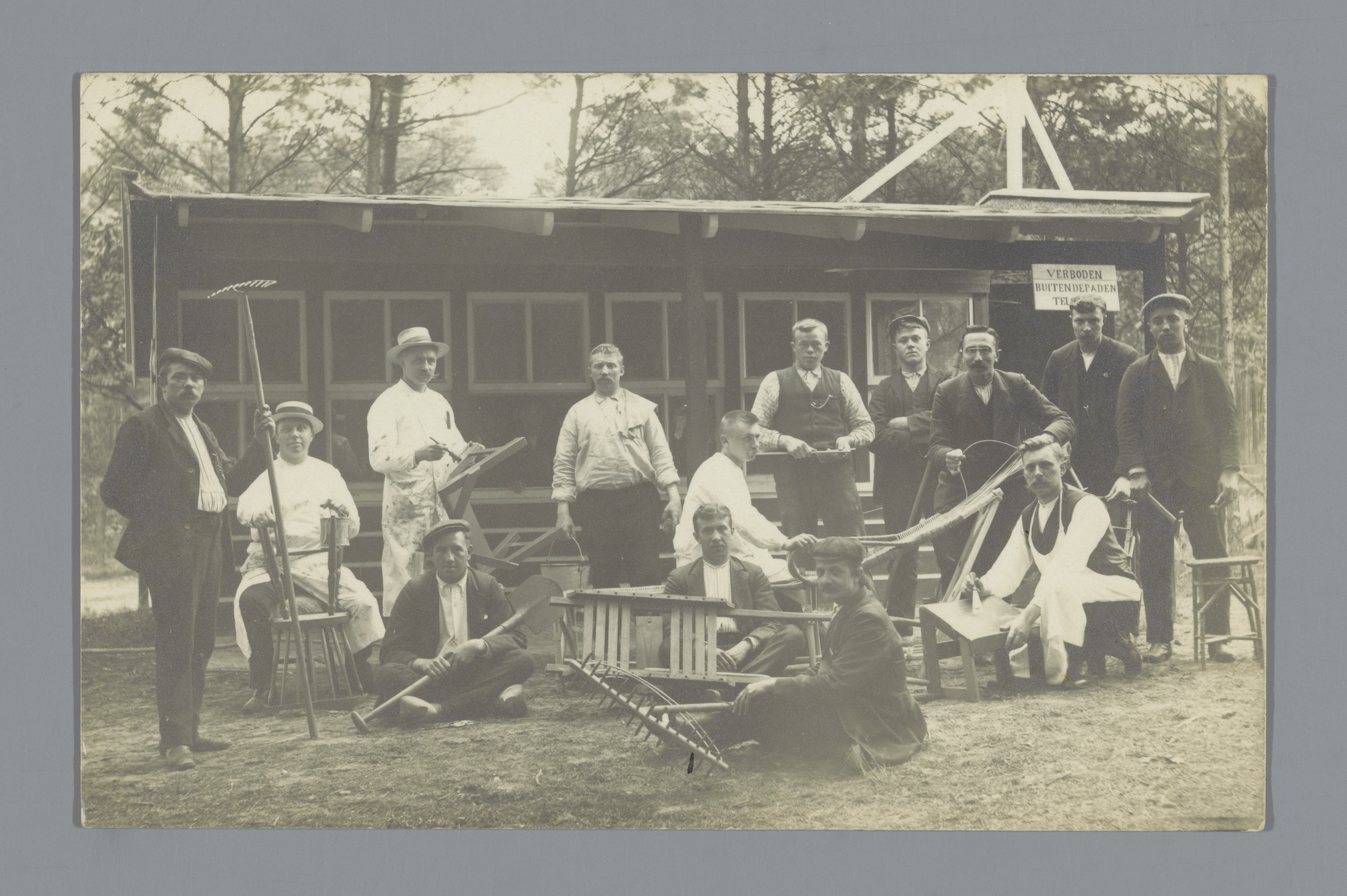 Groepsportret van onbekende mannen met werktuigen (v...