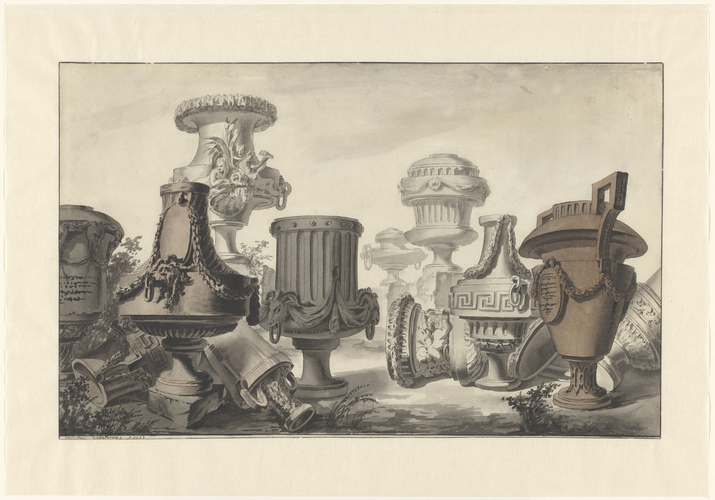 Neo-classicistische vazen in een landschap