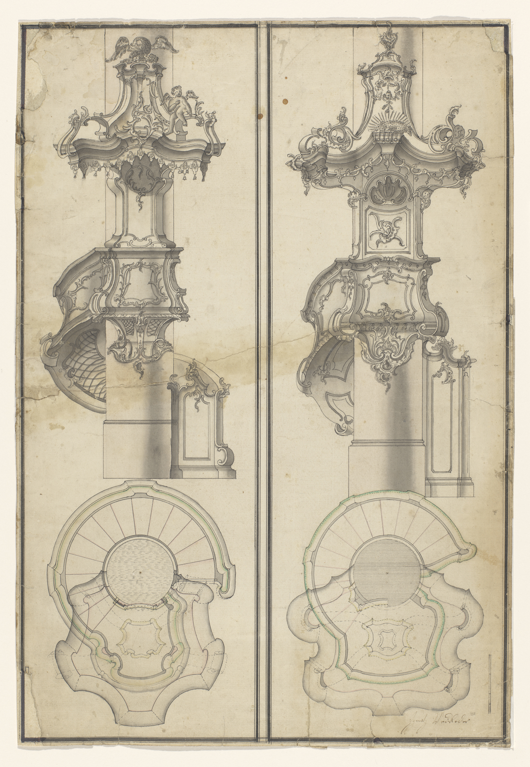 Twee preekstoelen, met daaronder bovenaanzichten