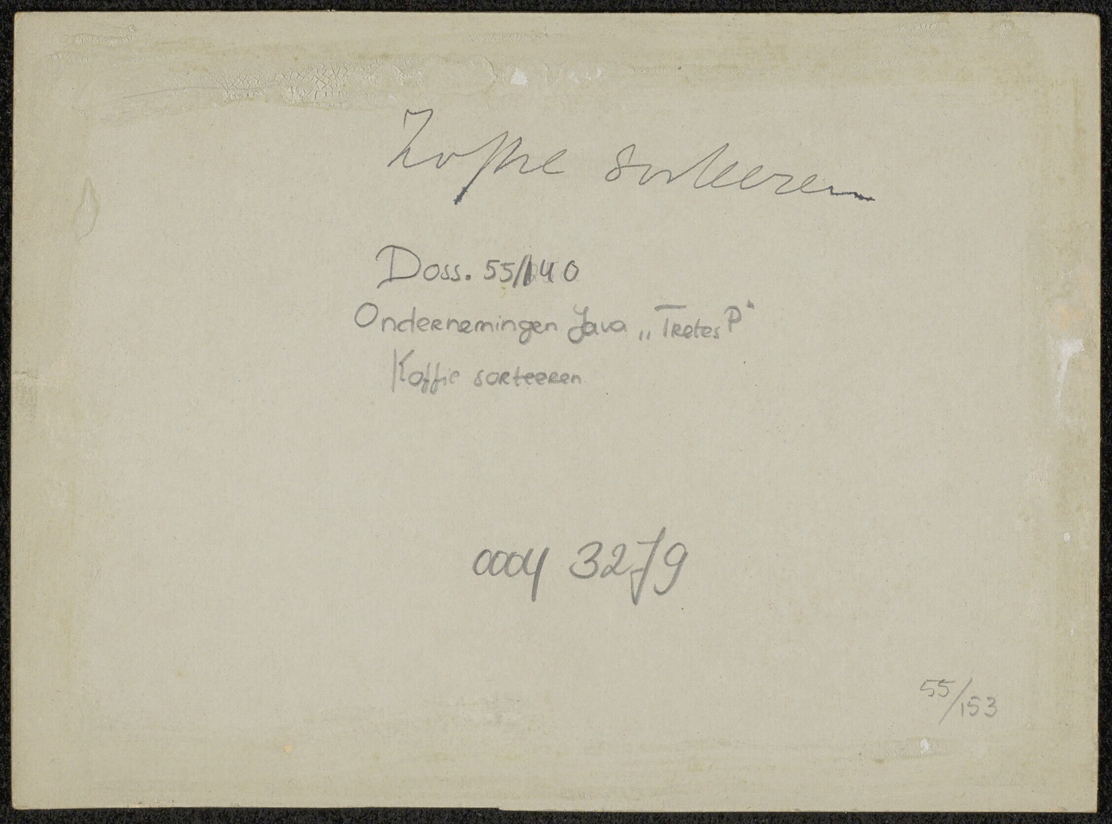 Het sorteren (?) van koffiebonen in een droogbak op ...