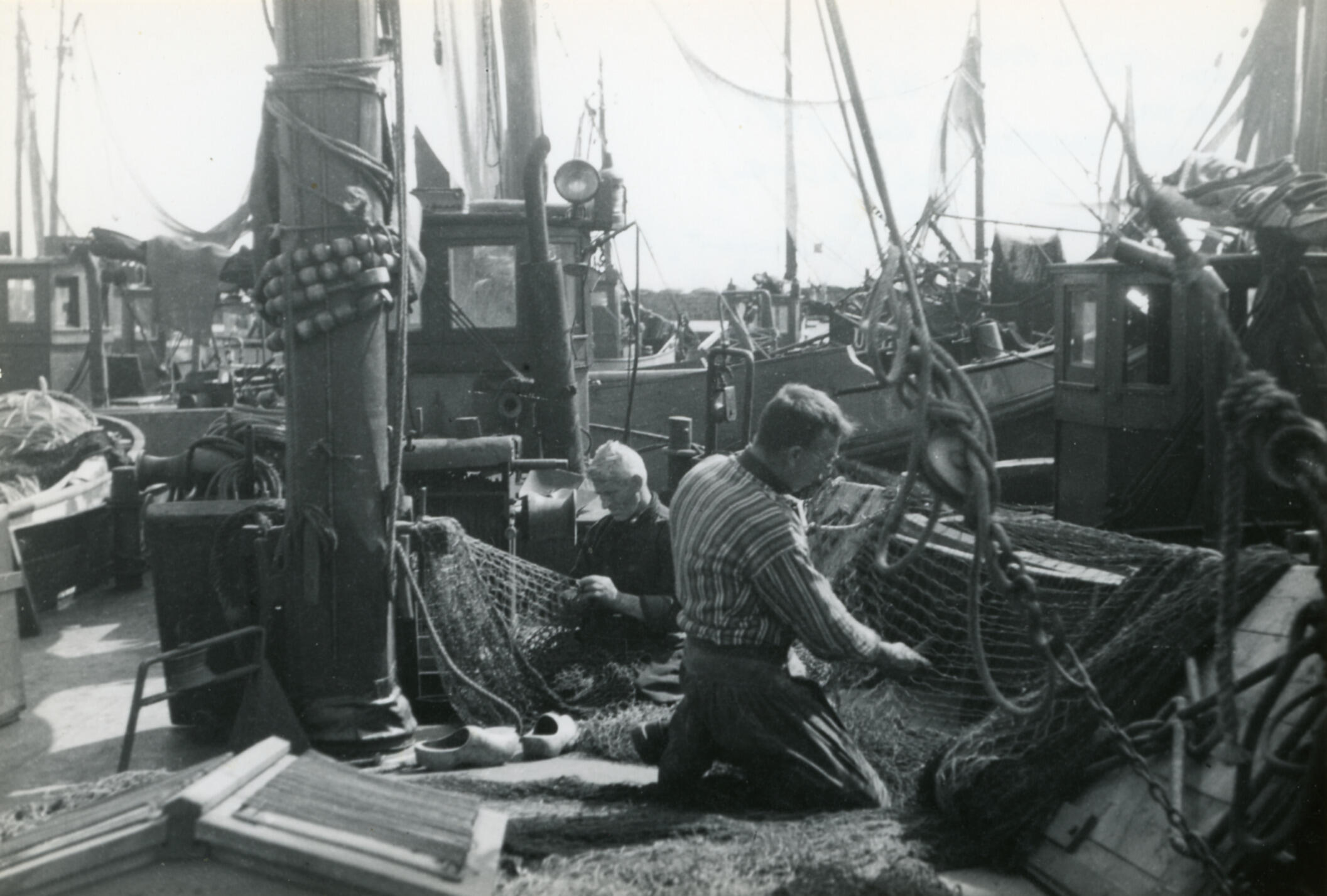 Twee vissers die netten boeten, Urk, 1948 (zwart-wit...