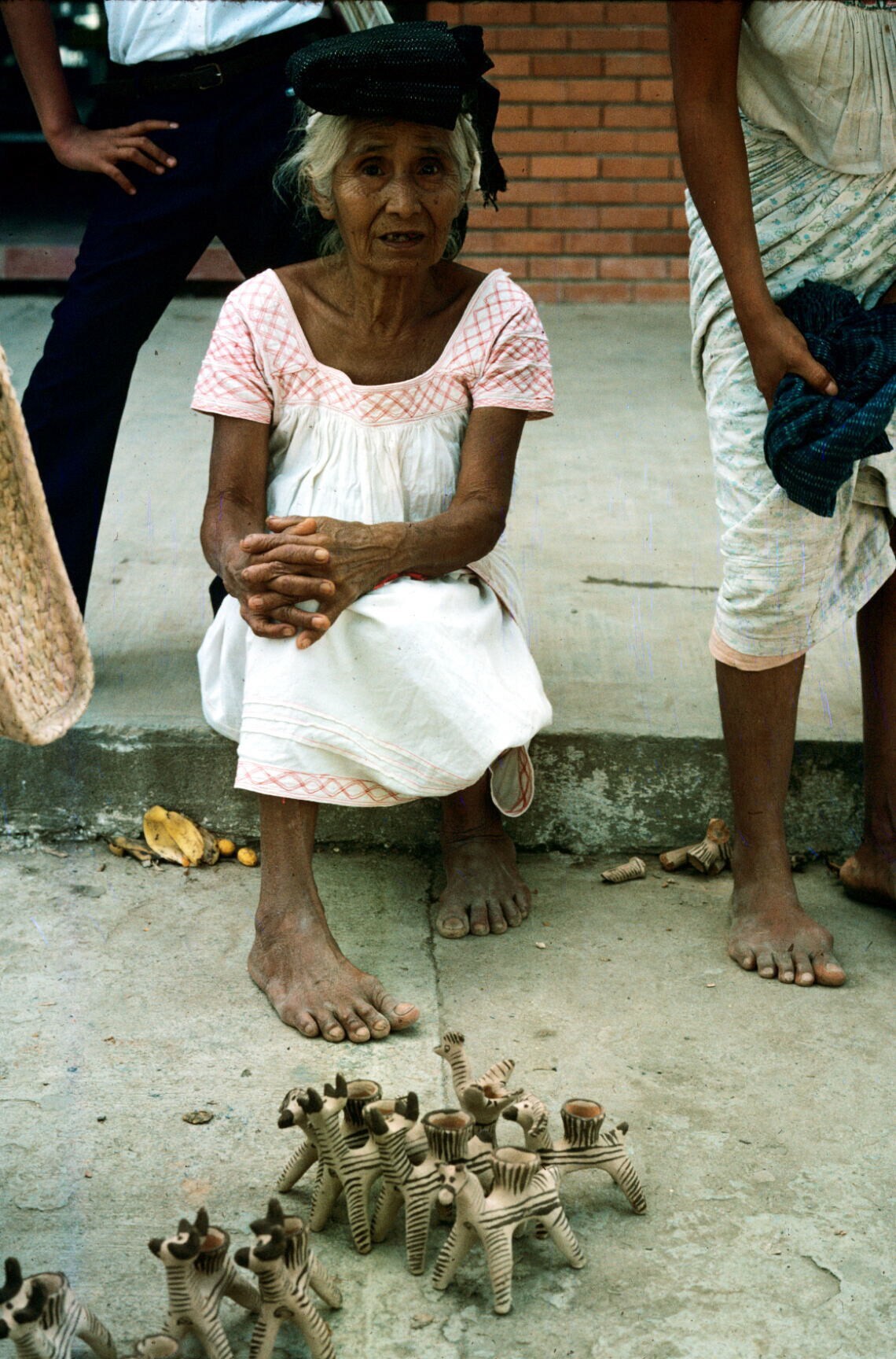 koopvrouw met aardewerk dierfiguurtjes op markt
