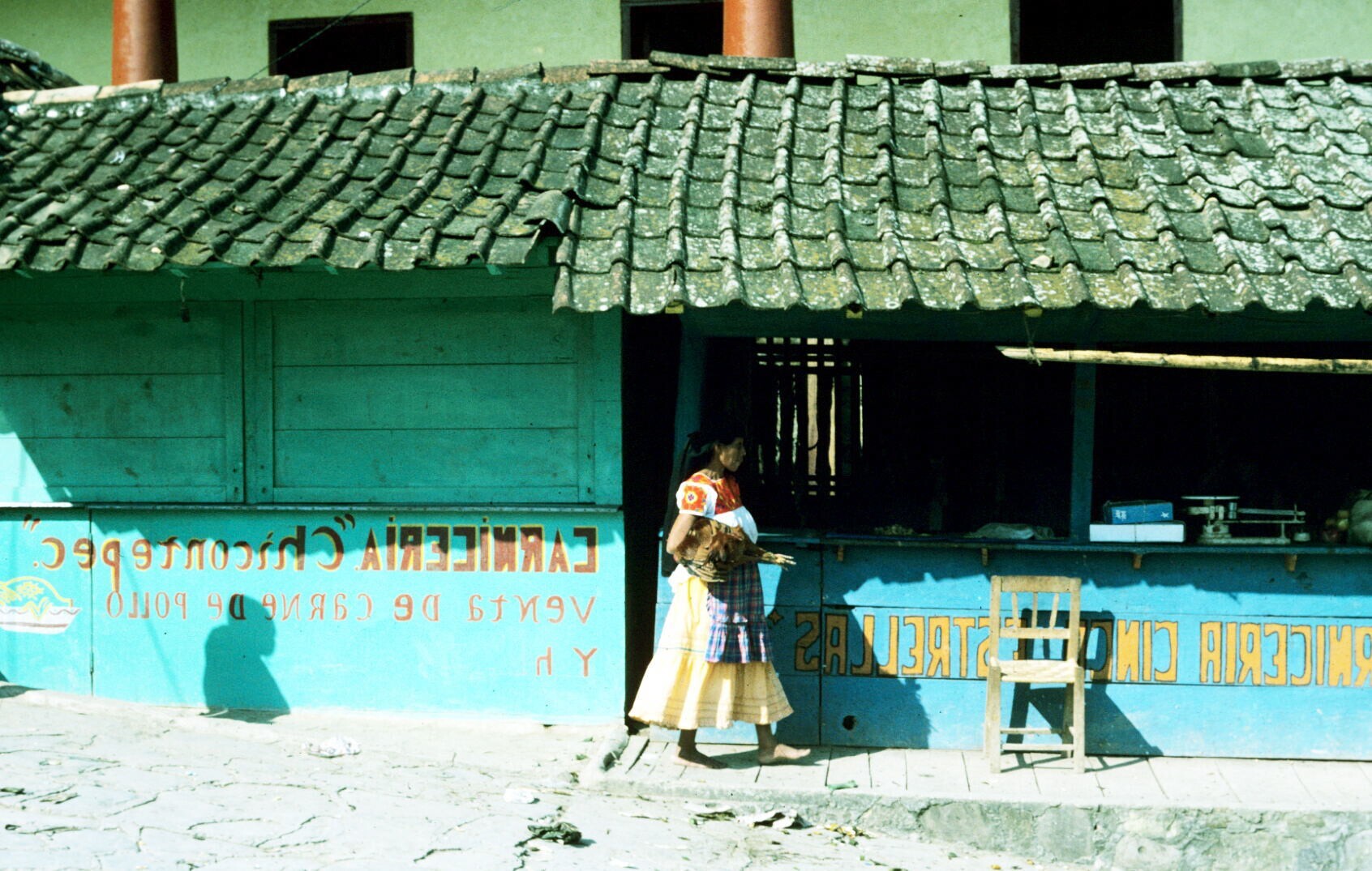 vrouw, lopend langs slagerijen op markt