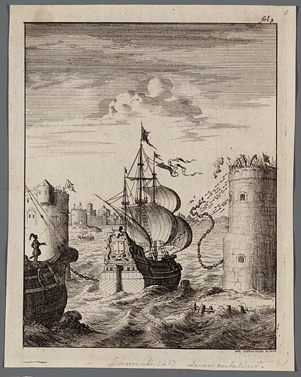 Het oorlogsschip van Haarlem zeilt de ketting in stu...