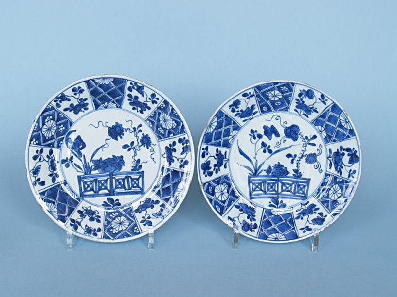 2 borden met decor van wilg, pioenroos, rots en hek