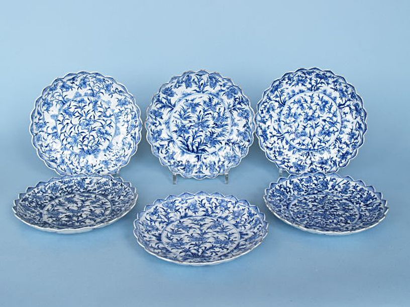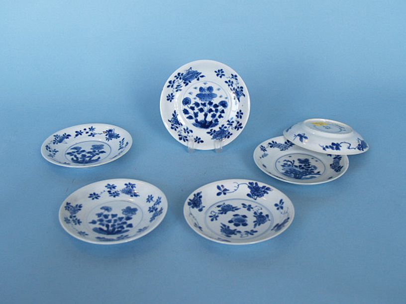 6 schoteltjes met floraal decor in onderglazuur blauw