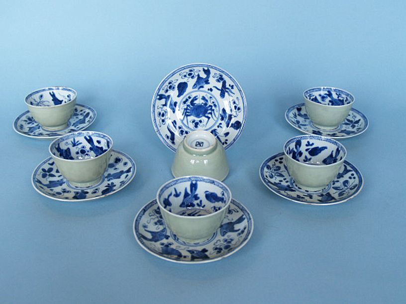 6 kop en schotels met decor van zeedieren, celadon e...