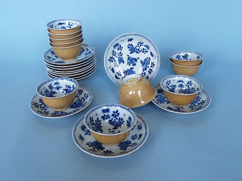 11 koppen en 12 schotels met decor van bloemen, café...