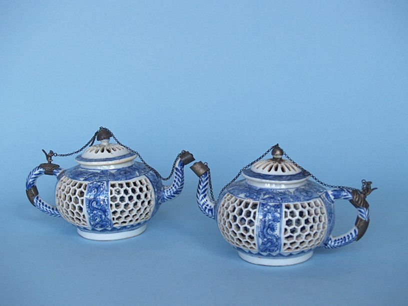 Theepot met ajourwerk en met blauwwit decor van bloe...