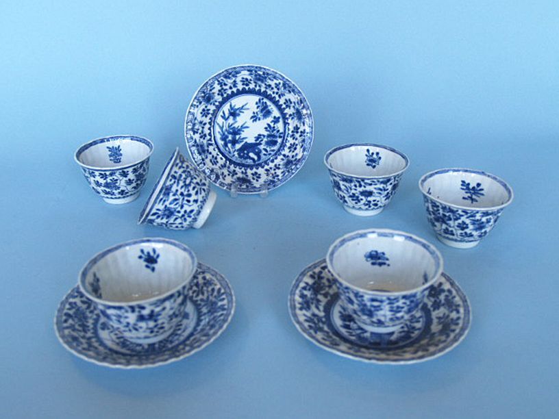 2 kopjes en 5 schoteltjes met decor van krullende bl...