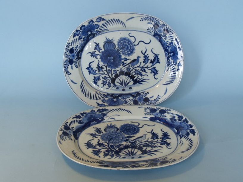 2 ovale schalen met decor van vogel op rots omgeven ...