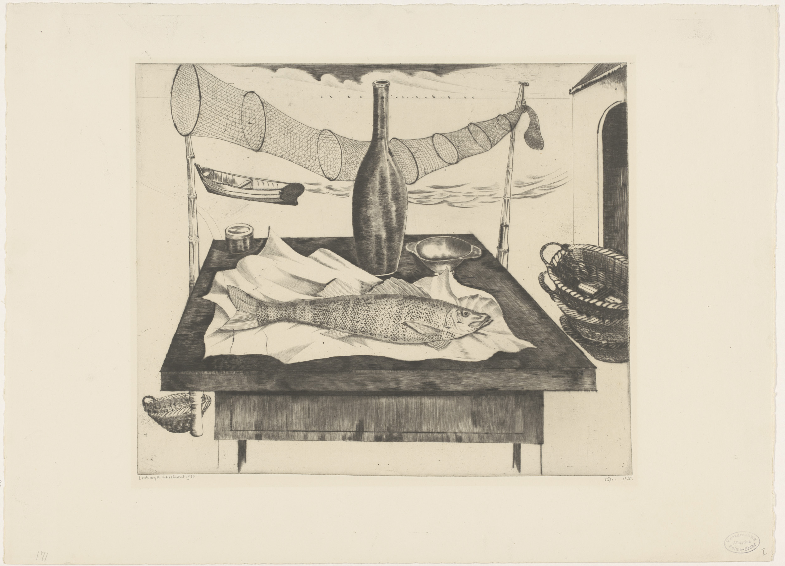 Stilleven met vis, fles en visnet