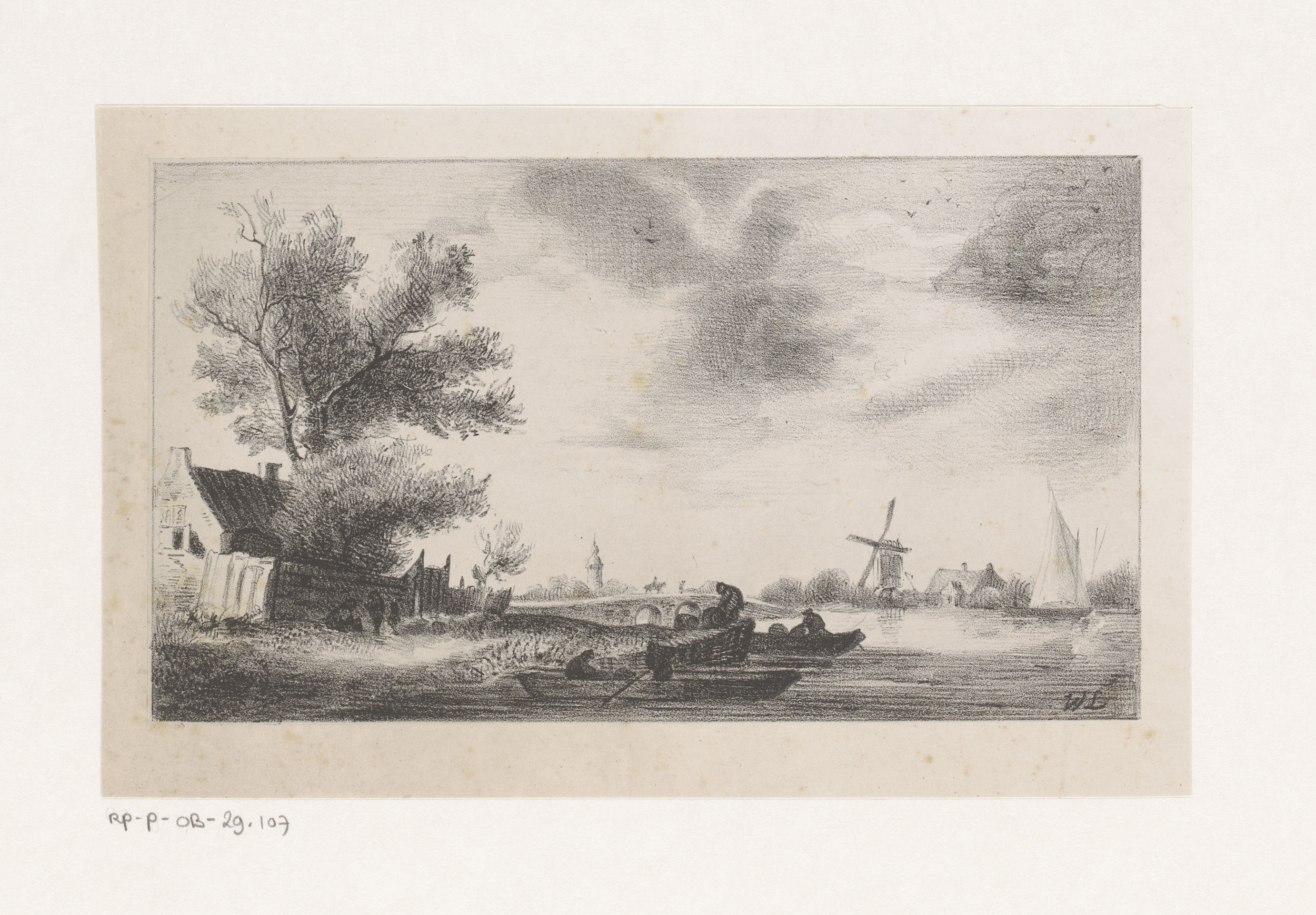 Riviergezicht met boten en windmolen