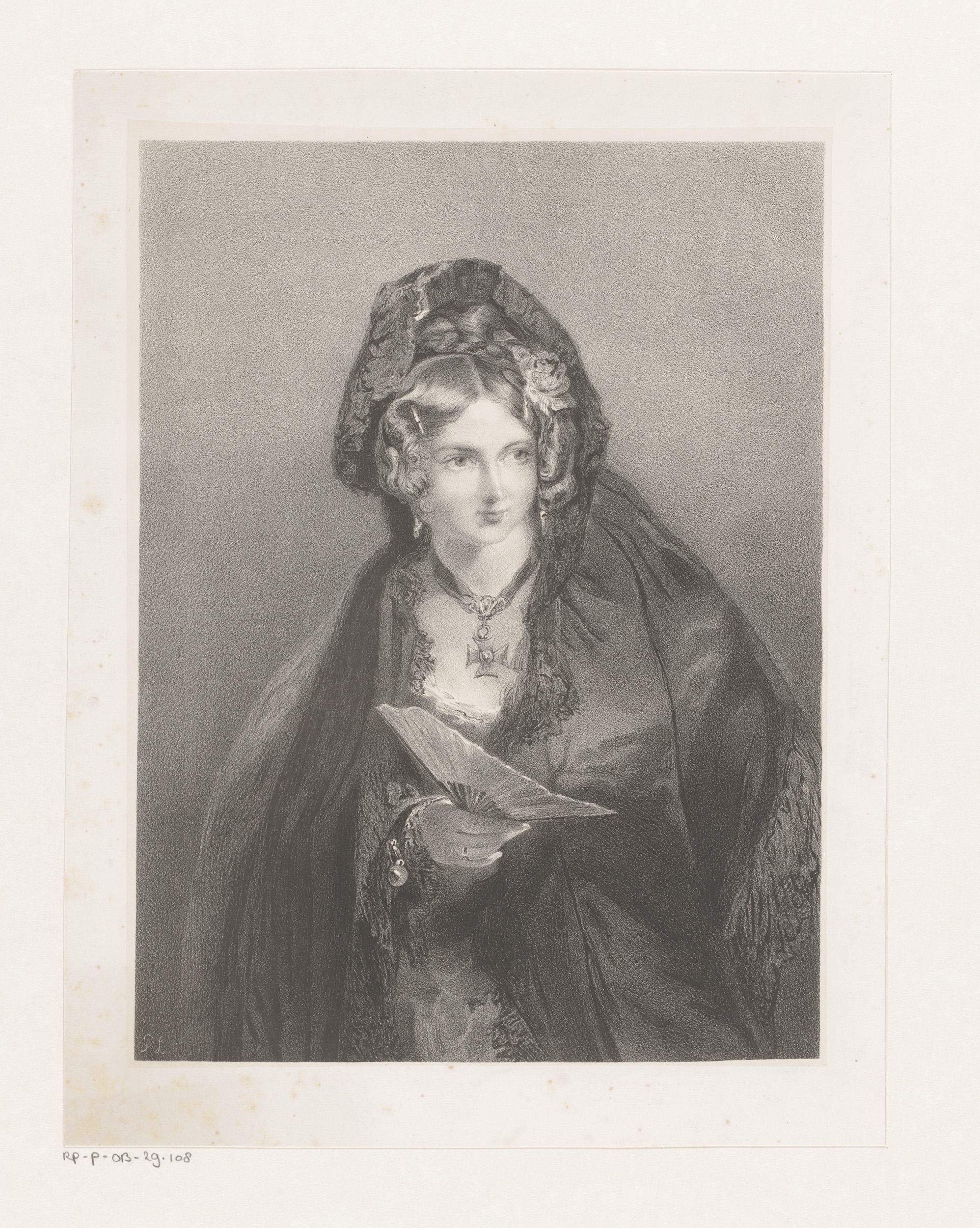Jonge vrouw met omslagdoek en waaier