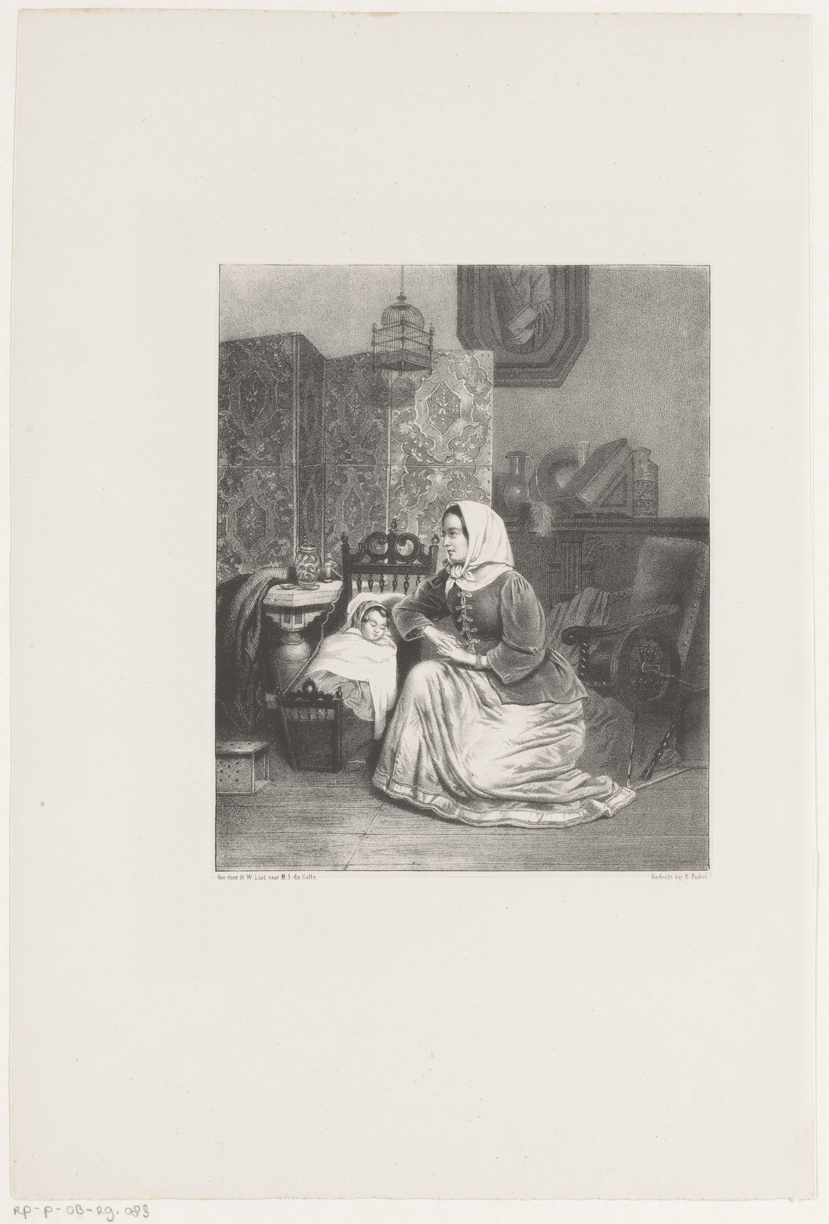 Interieur met vrouw en slapend kind