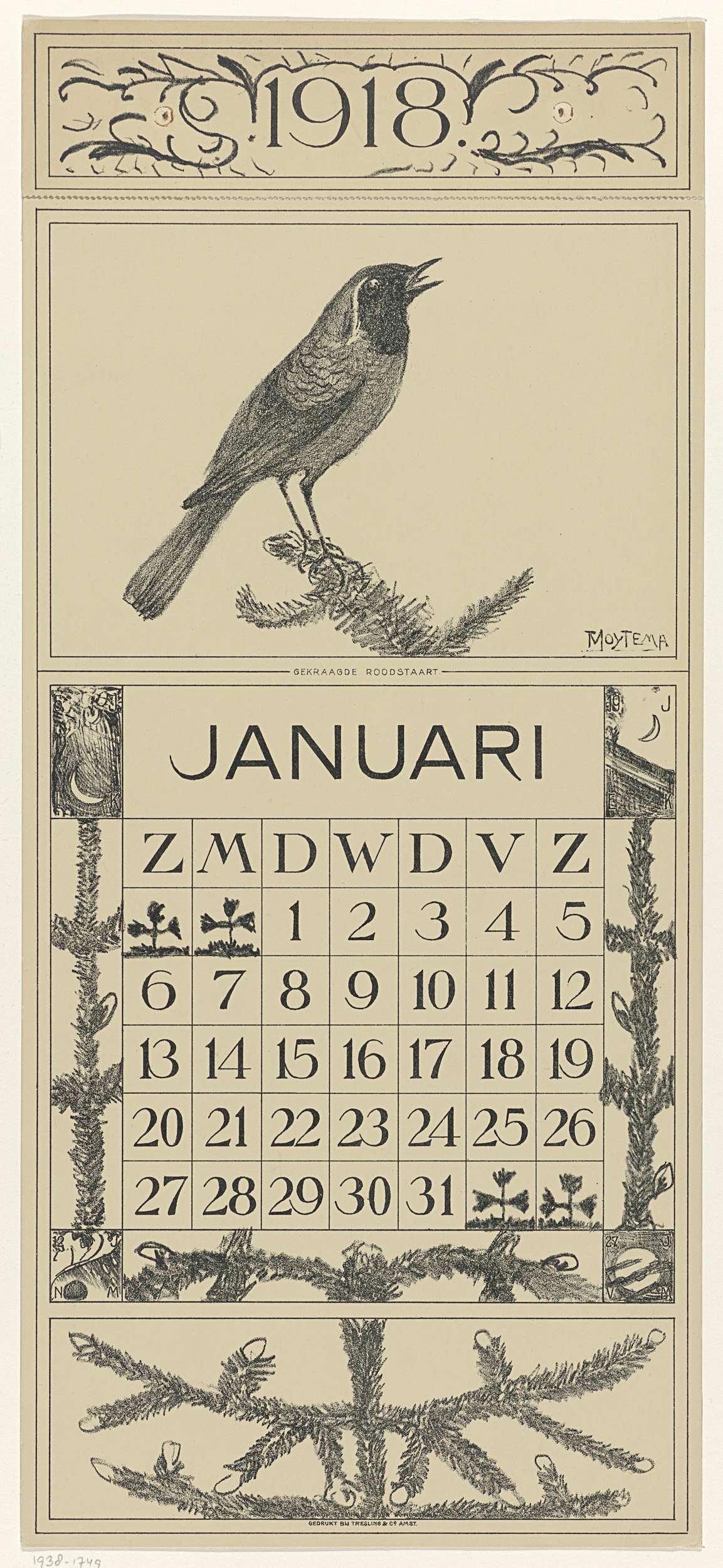 Kalenderblad januari met gekraagde roodstaart