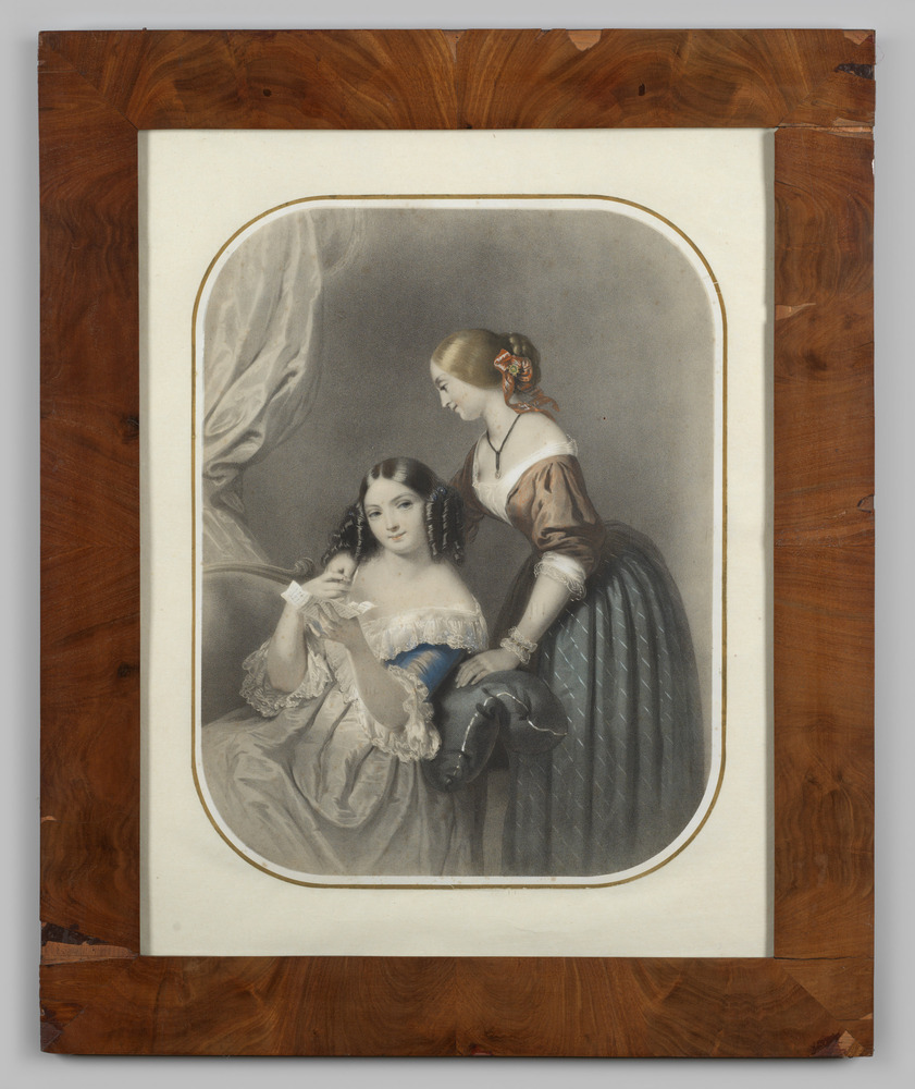 Gekleurde lithografie van twee jonge vrouwen met een...
