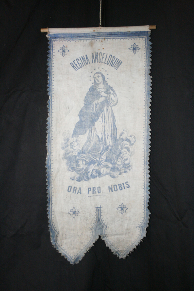 Mariavaandeltje met Maria in blauwdruk op witte stof...