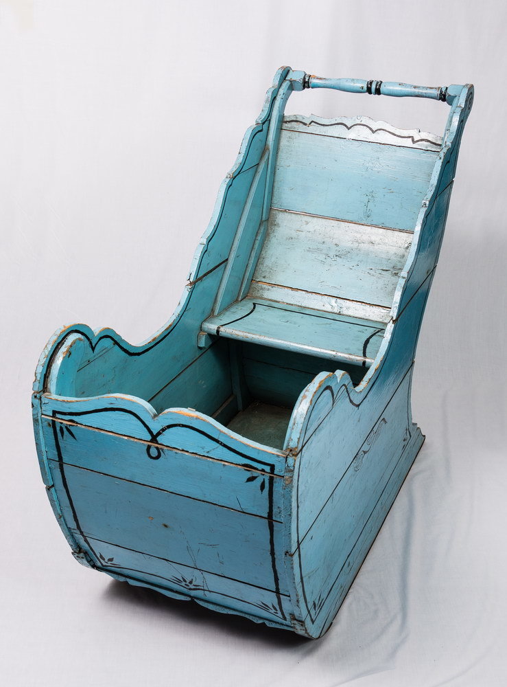Arreslee van blauw geverfd hout, vervaardigd door ee...