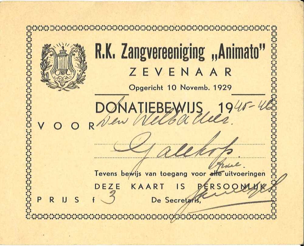 Donatiebewijs op papier van R.K. Zangvereniging 'Ani...