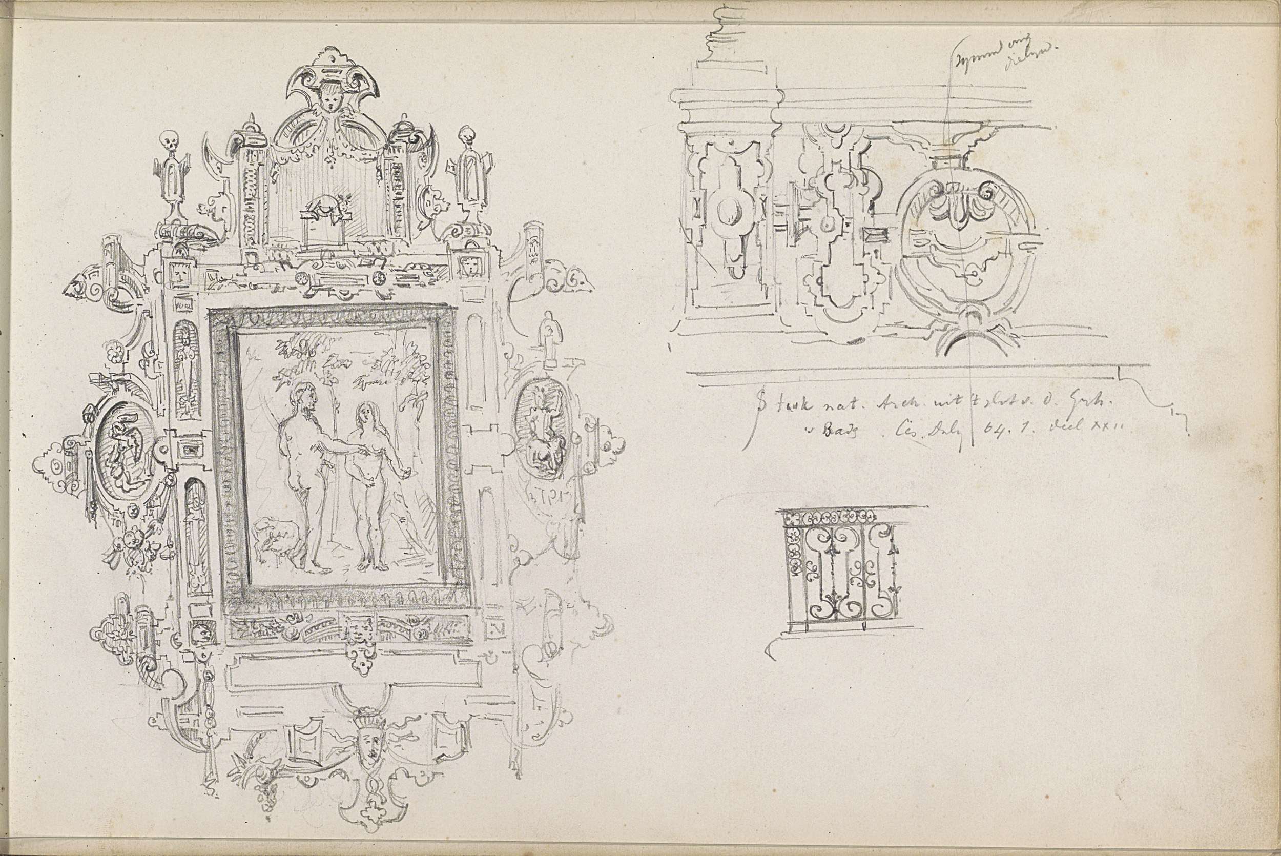 Voorstelling van Adam en Eva in ornamentele omlijsting
