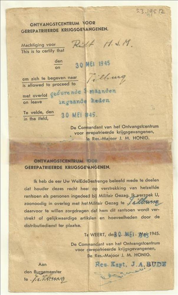 Toestemming aan H.J.M. Ridt om naar Tilburg te gaan