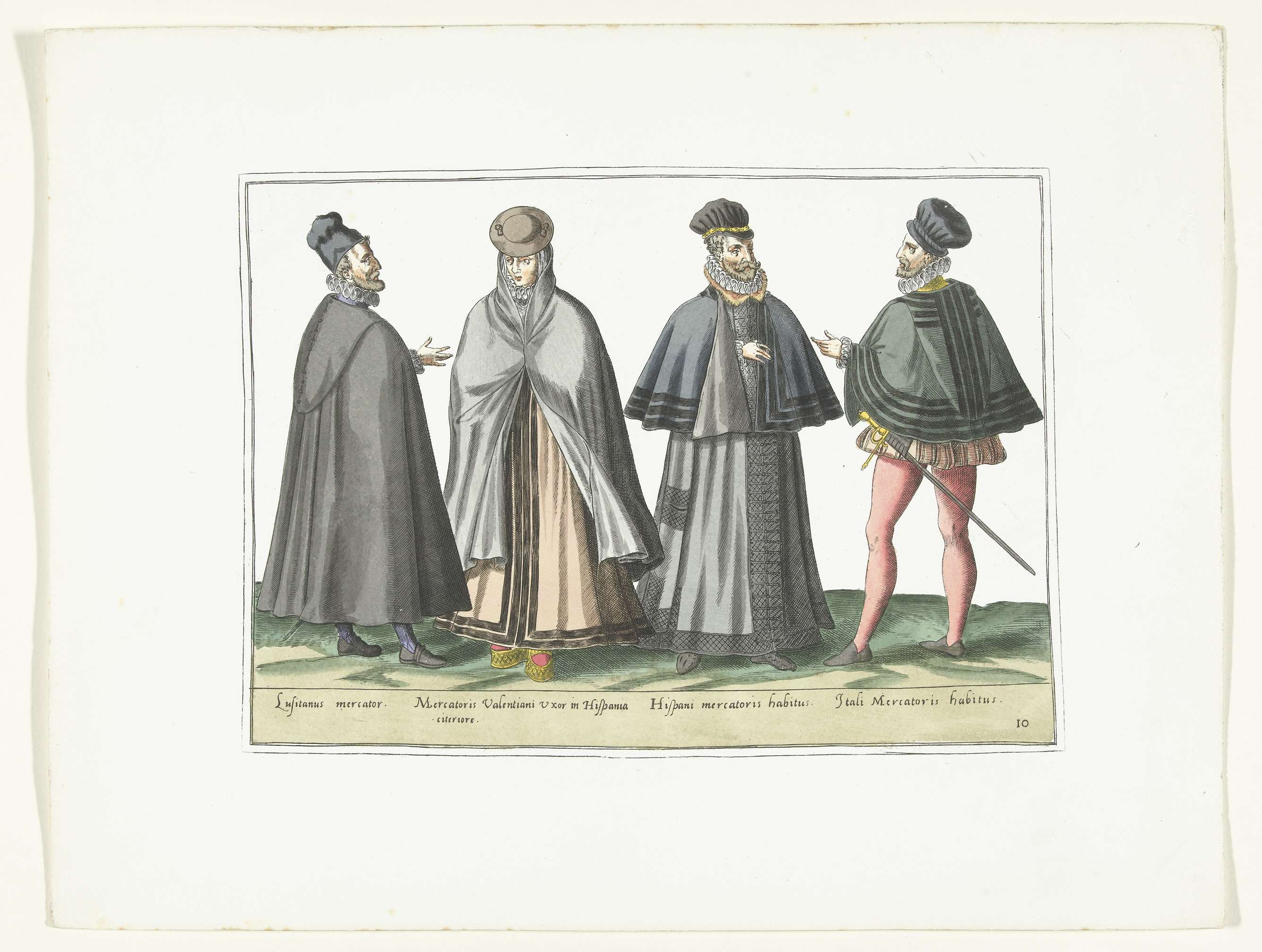 Drie mannen en een vrouw gekleed volgens de buitenla...