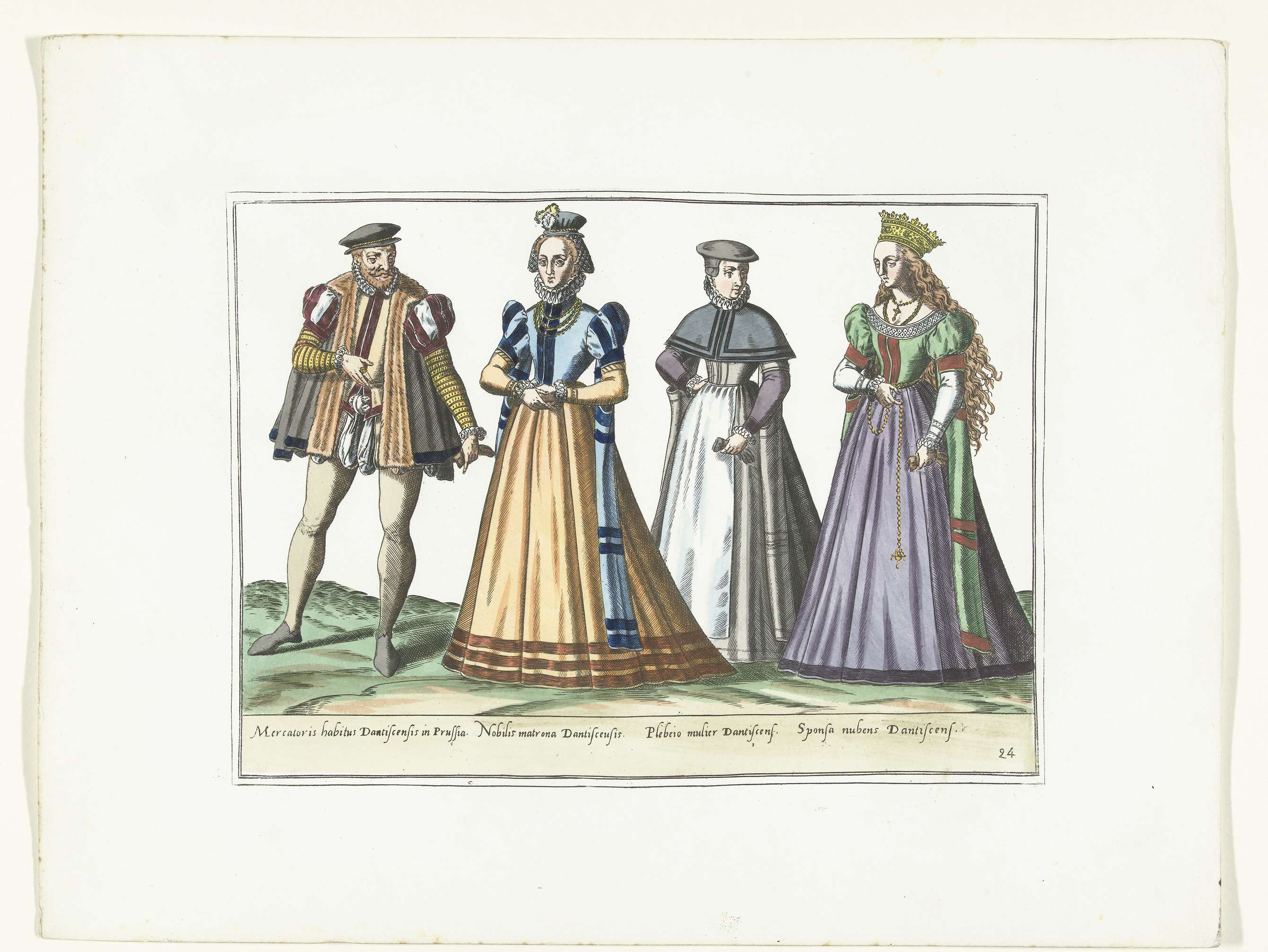 Drie vrouwen en een man gekleed volgens de Duitse mo...