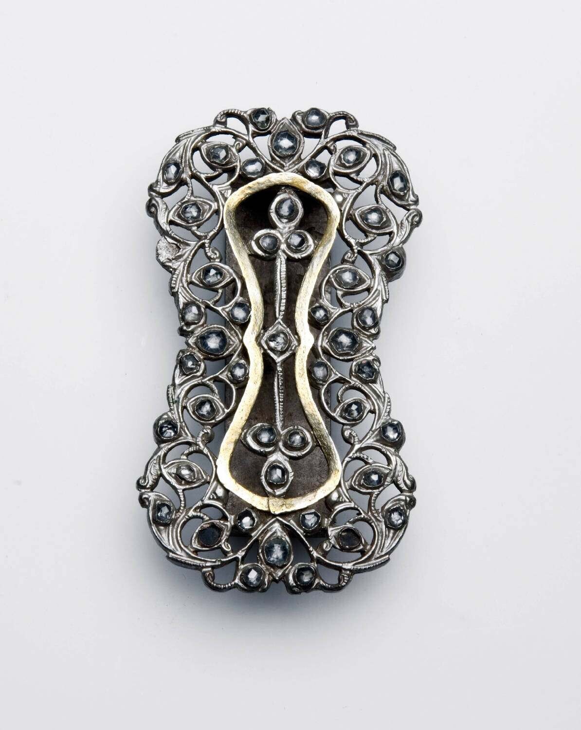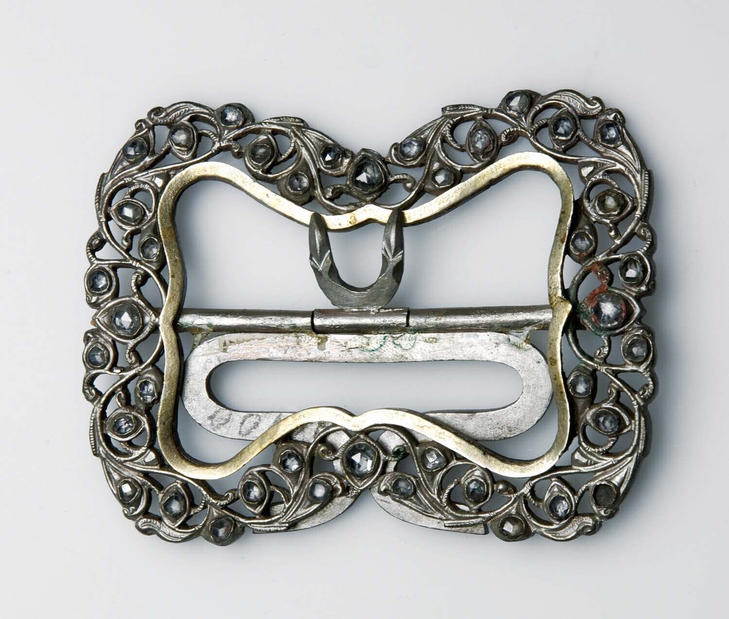 Smalle zilveren gesp met glasdiamantjes, behorend bi...