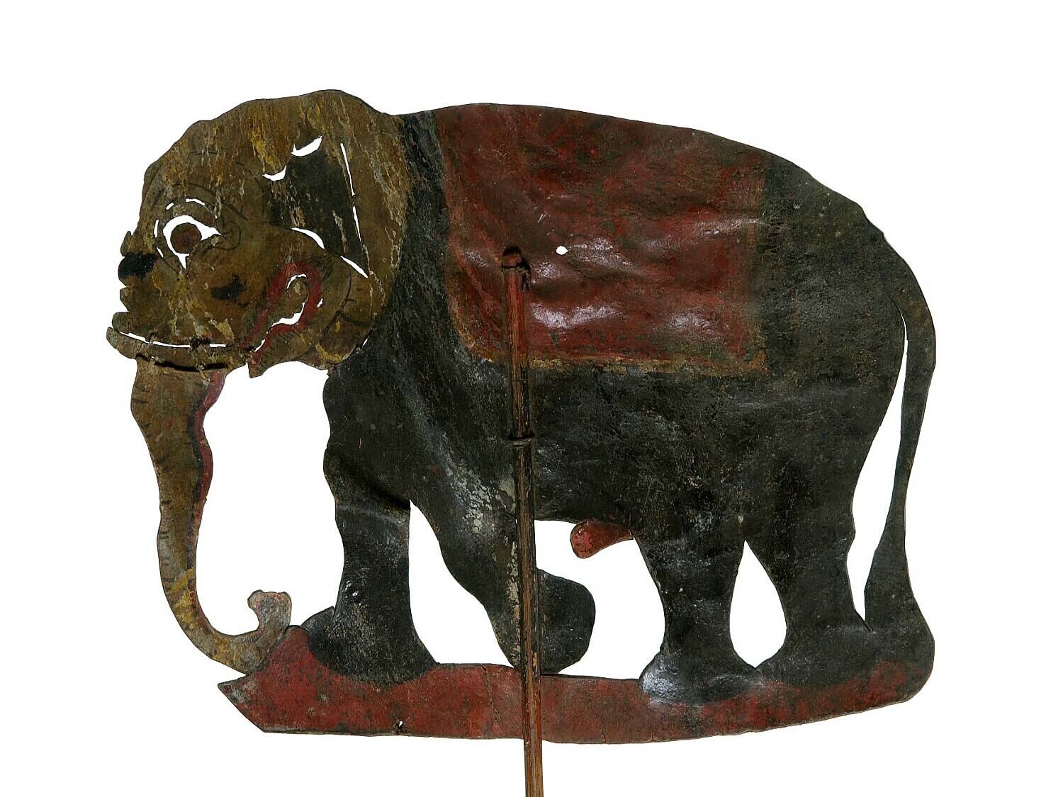 Wajangfiguur van karbouwenhuid, een staande olifant ...