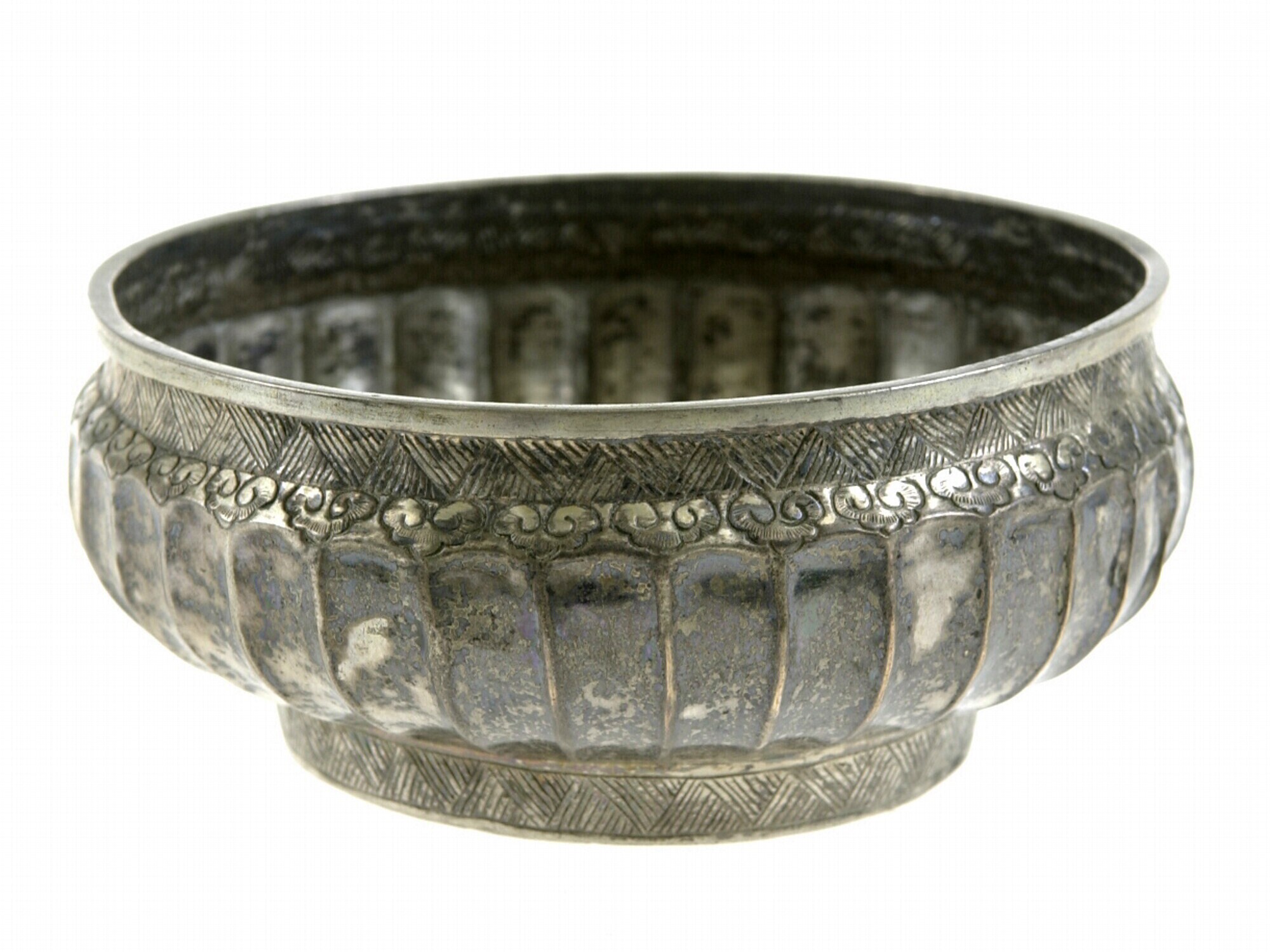 Kwispedoor van zilver, versierd met bladkrulornamenten
