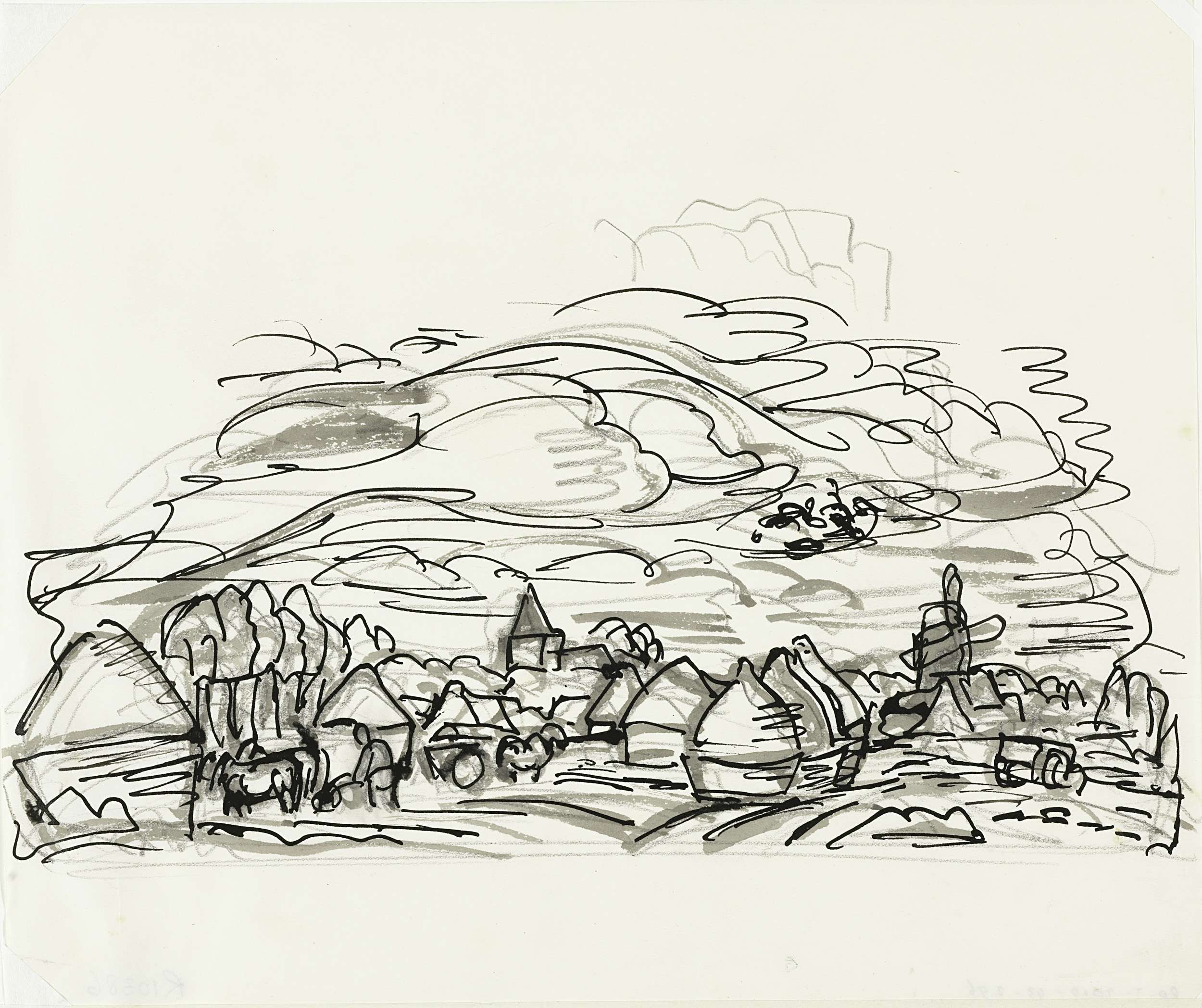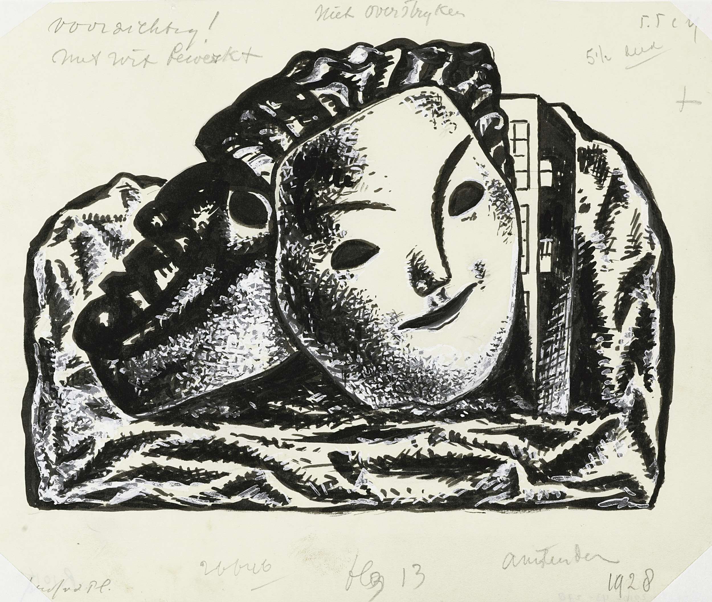 Twee maskers voor gebouw en rotsen (schets)