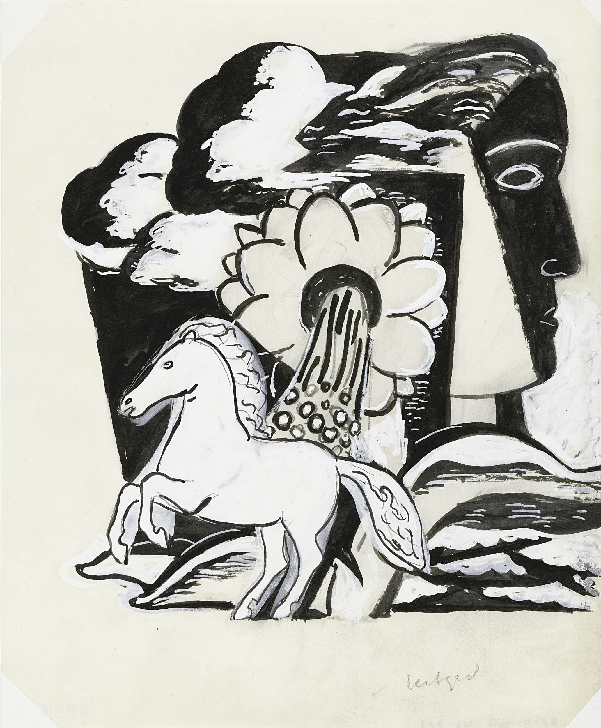 Steigerend paard, bloem en kop (schets)