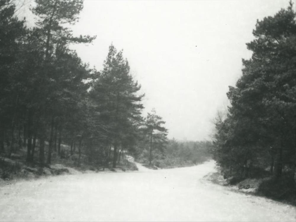 weg tussen dennenbomen