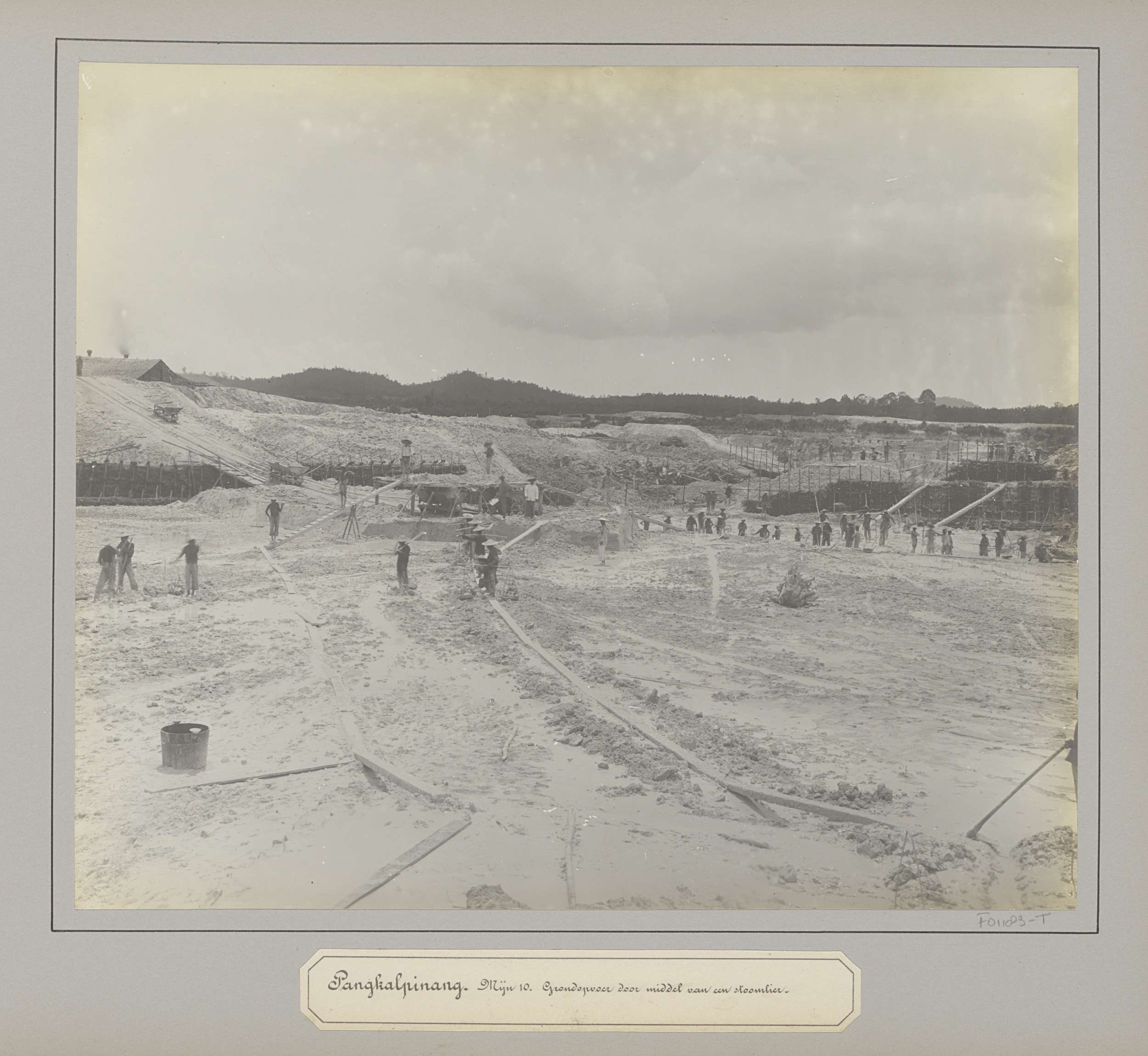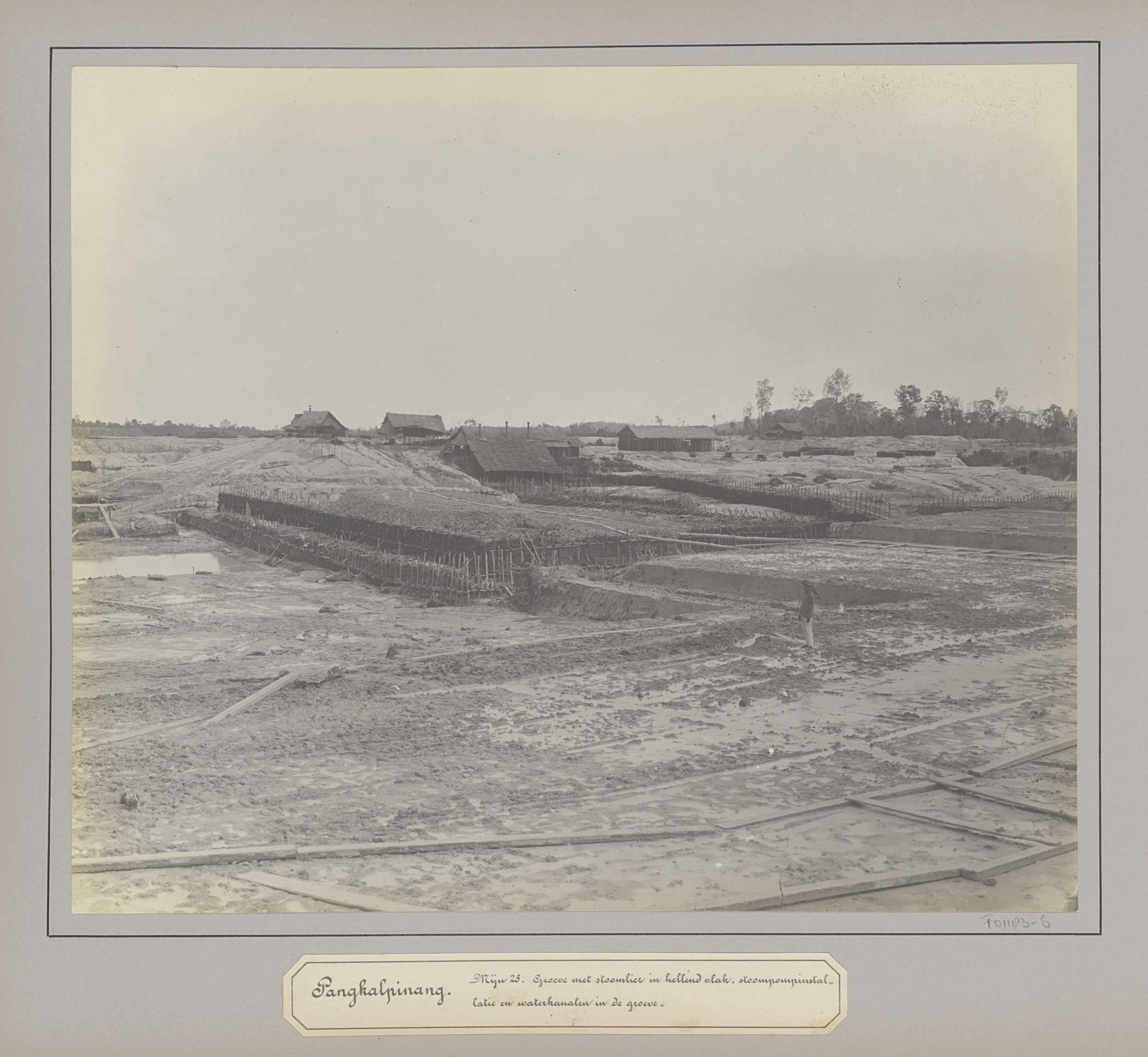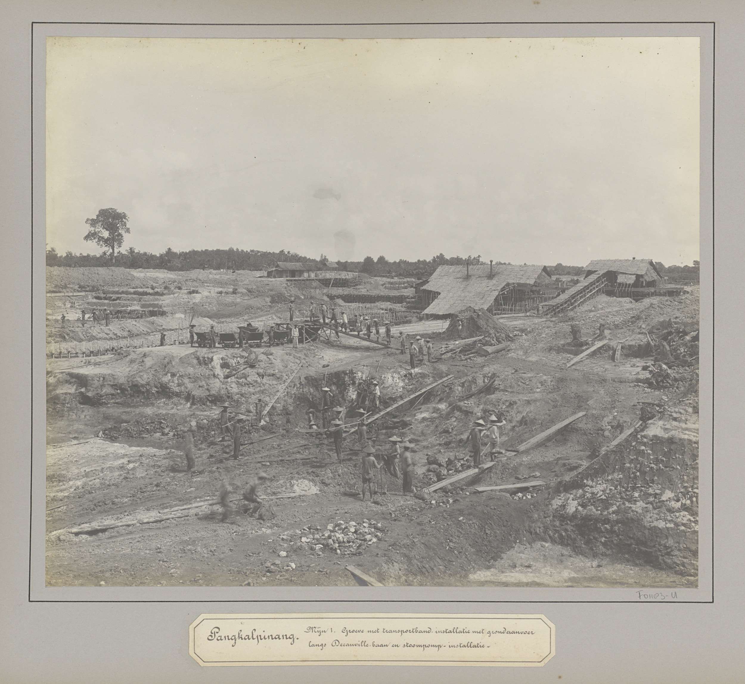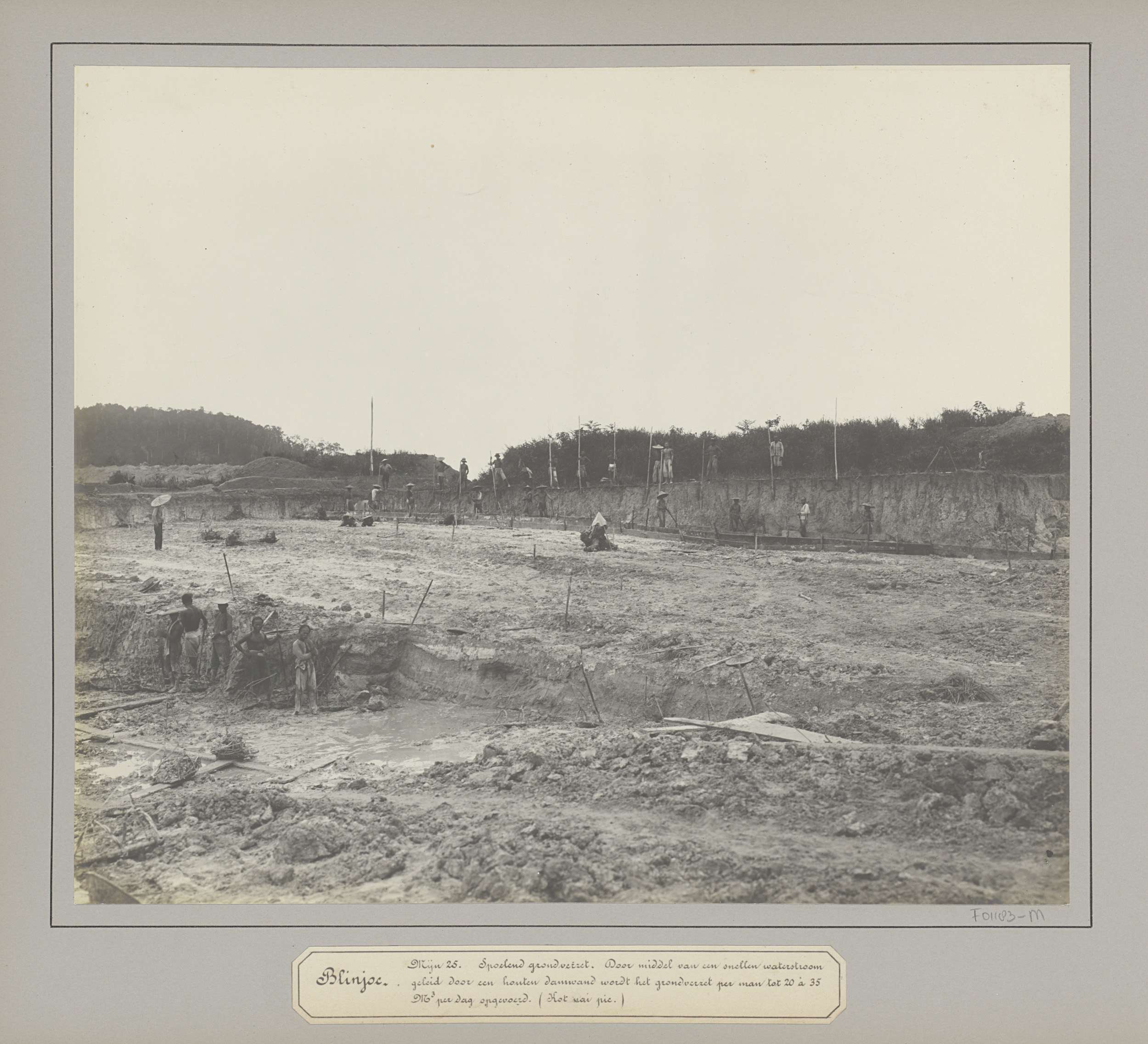Gezicht op een open tingroeve met arbeiders te Belinyu