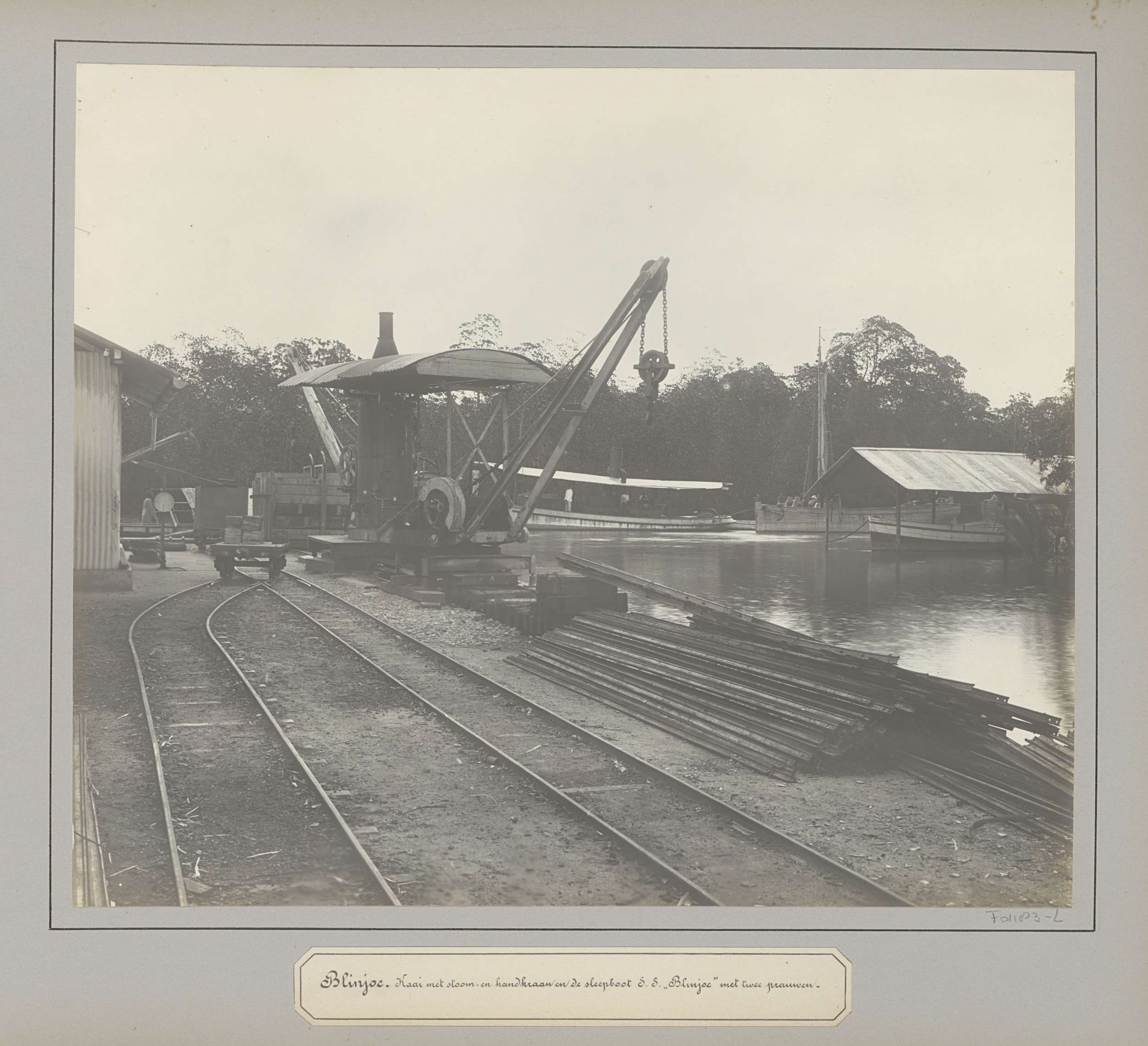Kade met kranen en boten bij een tinonderneming te B...