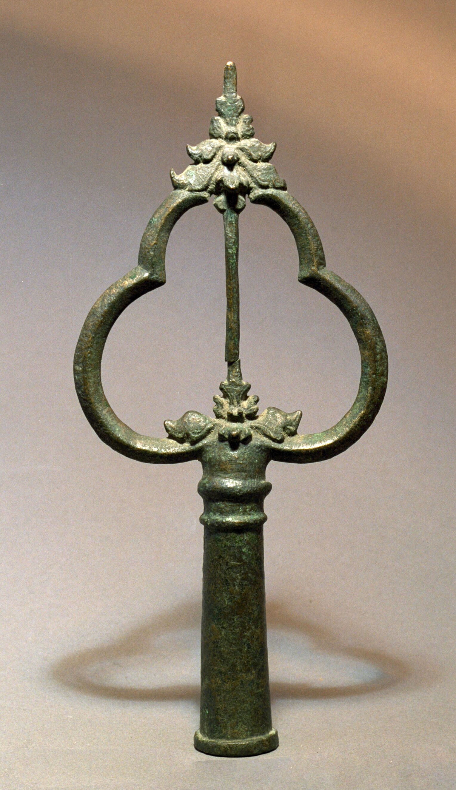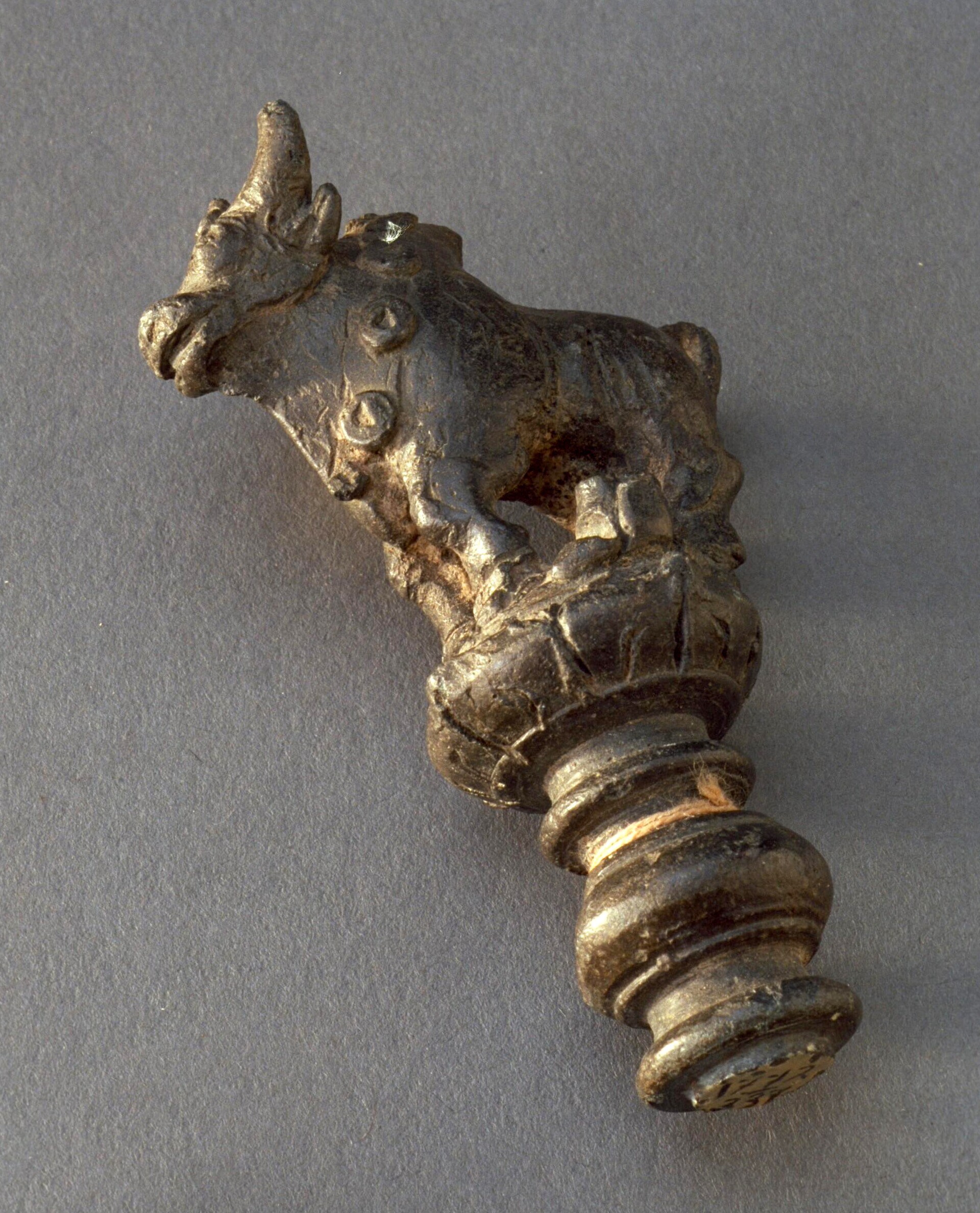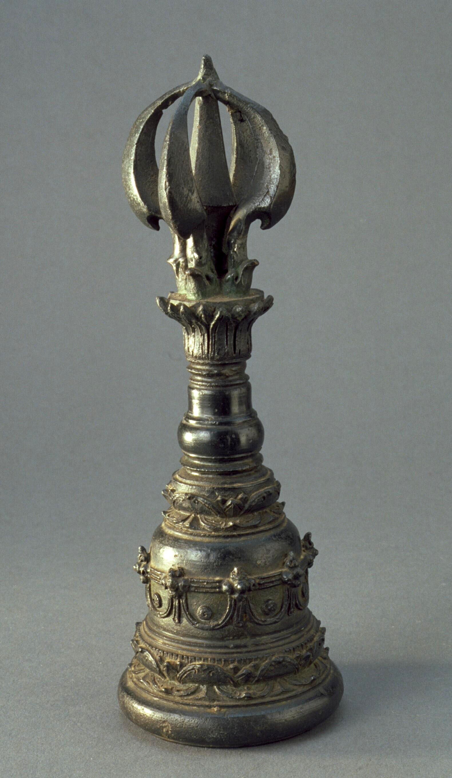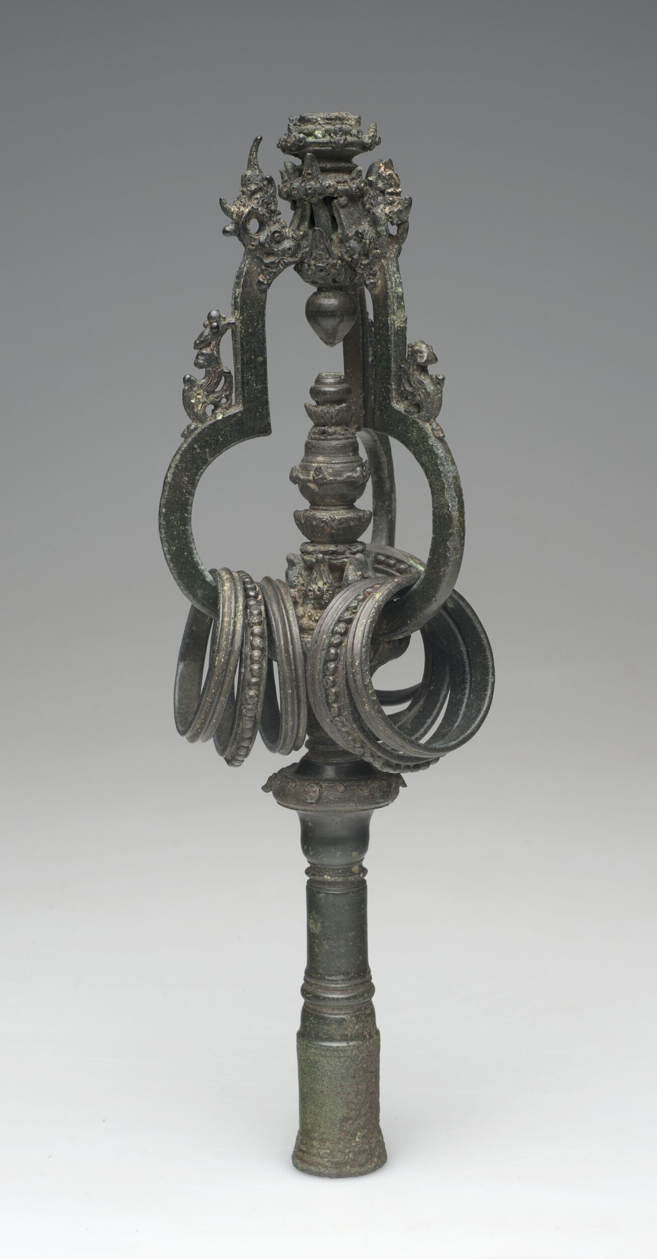 Bronzen topstuk van een rinkelstaf van een monik, to...