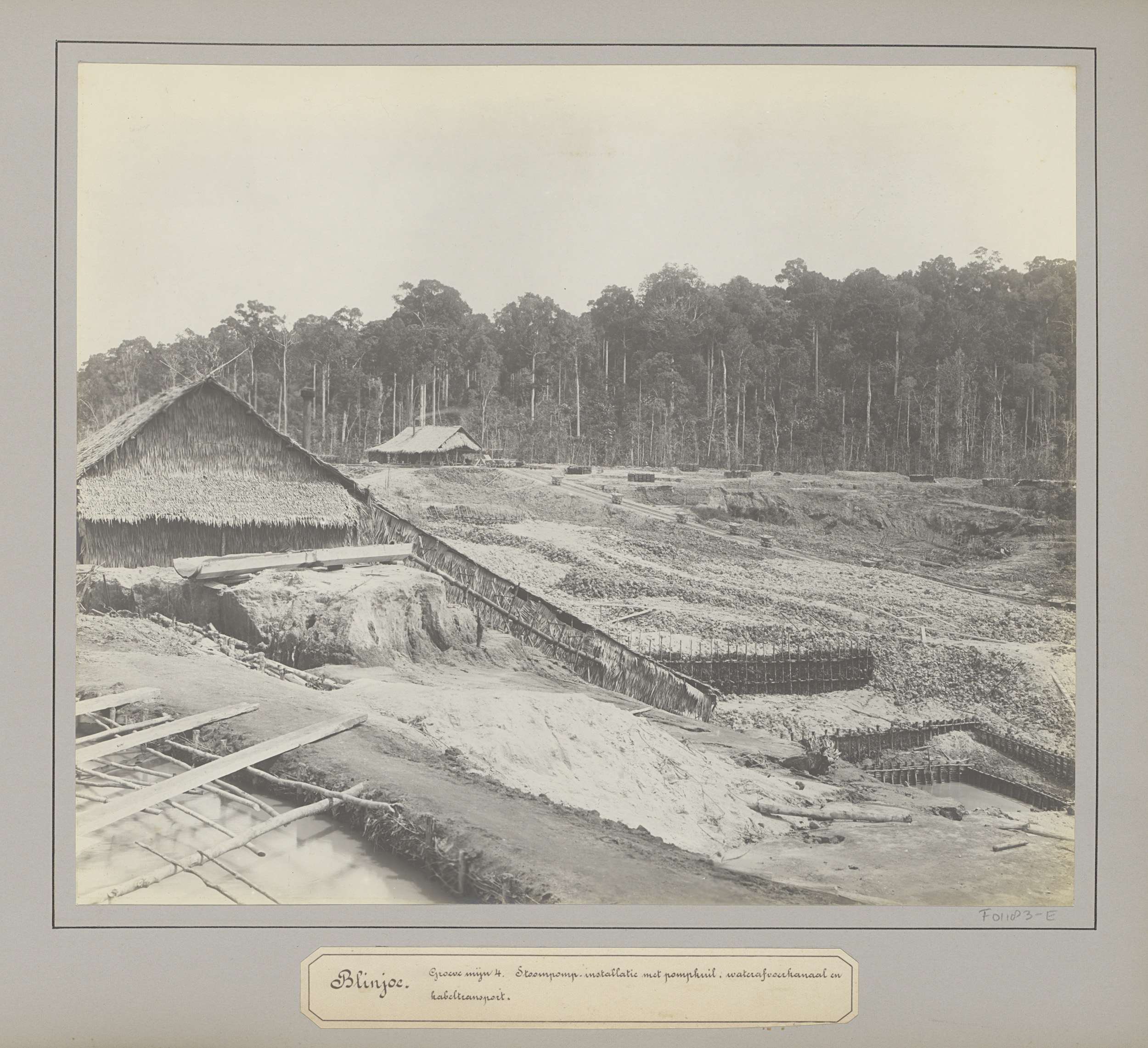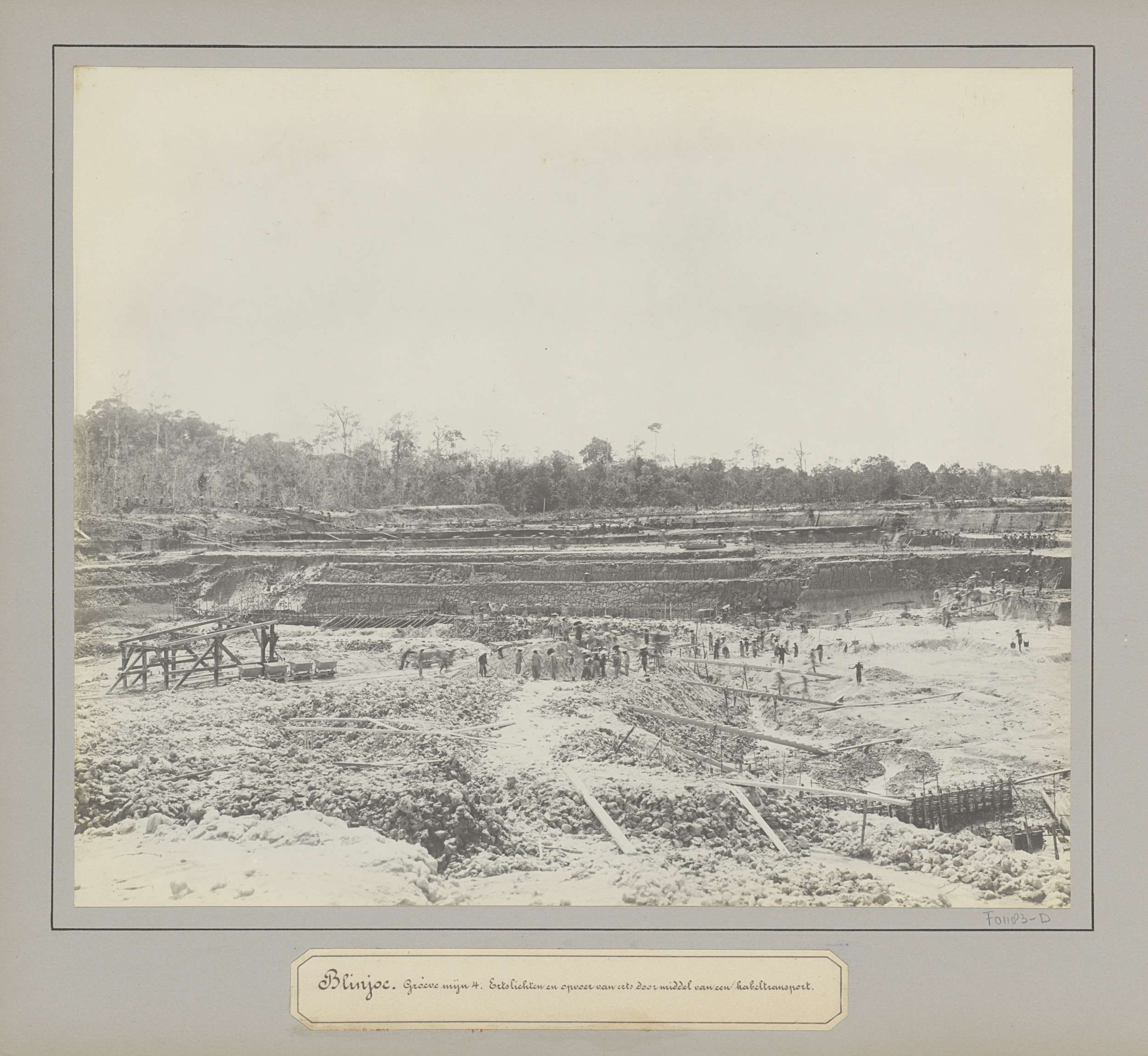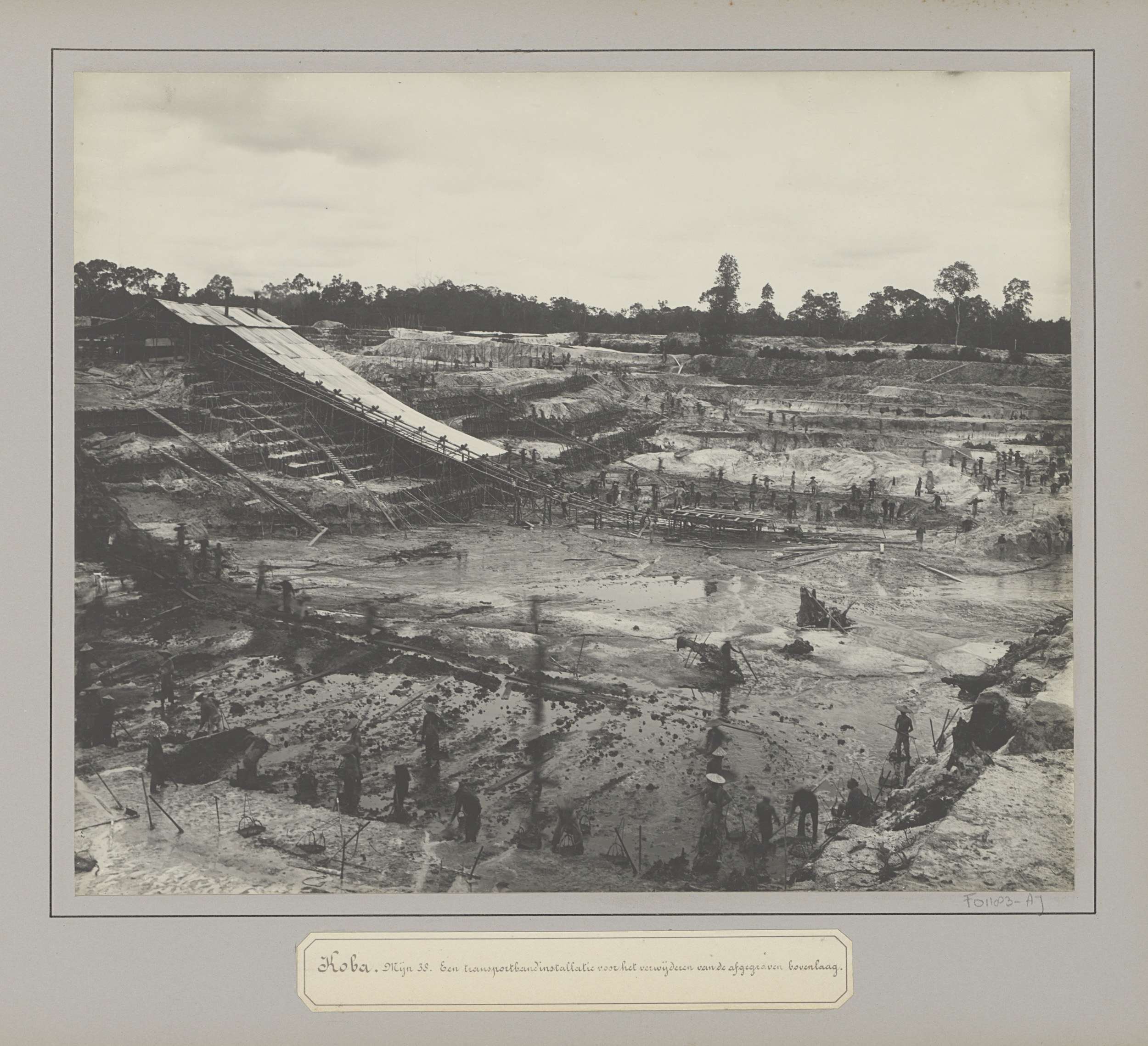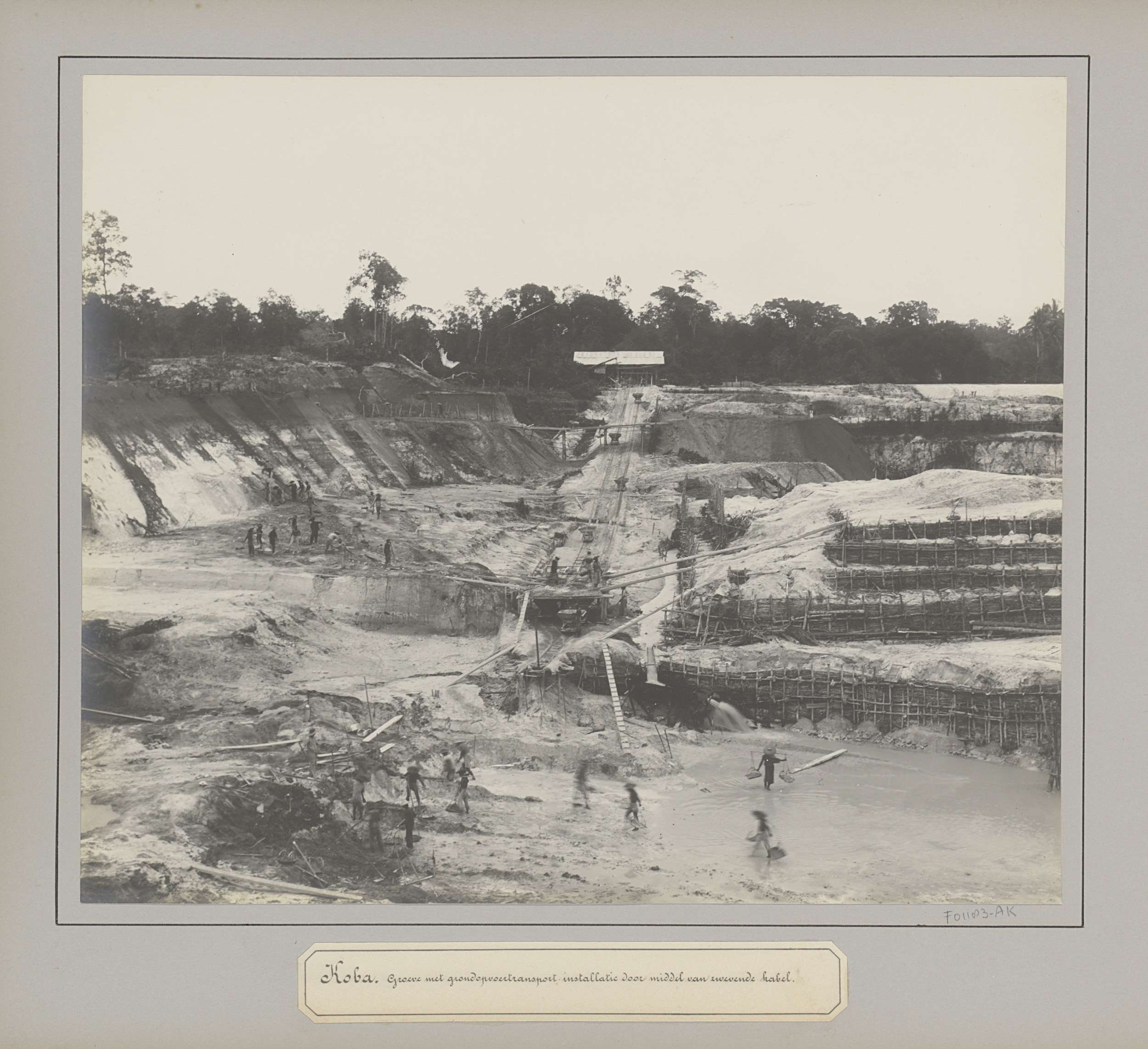 Gezicht op een tingroeve te Koba met transportinstal...