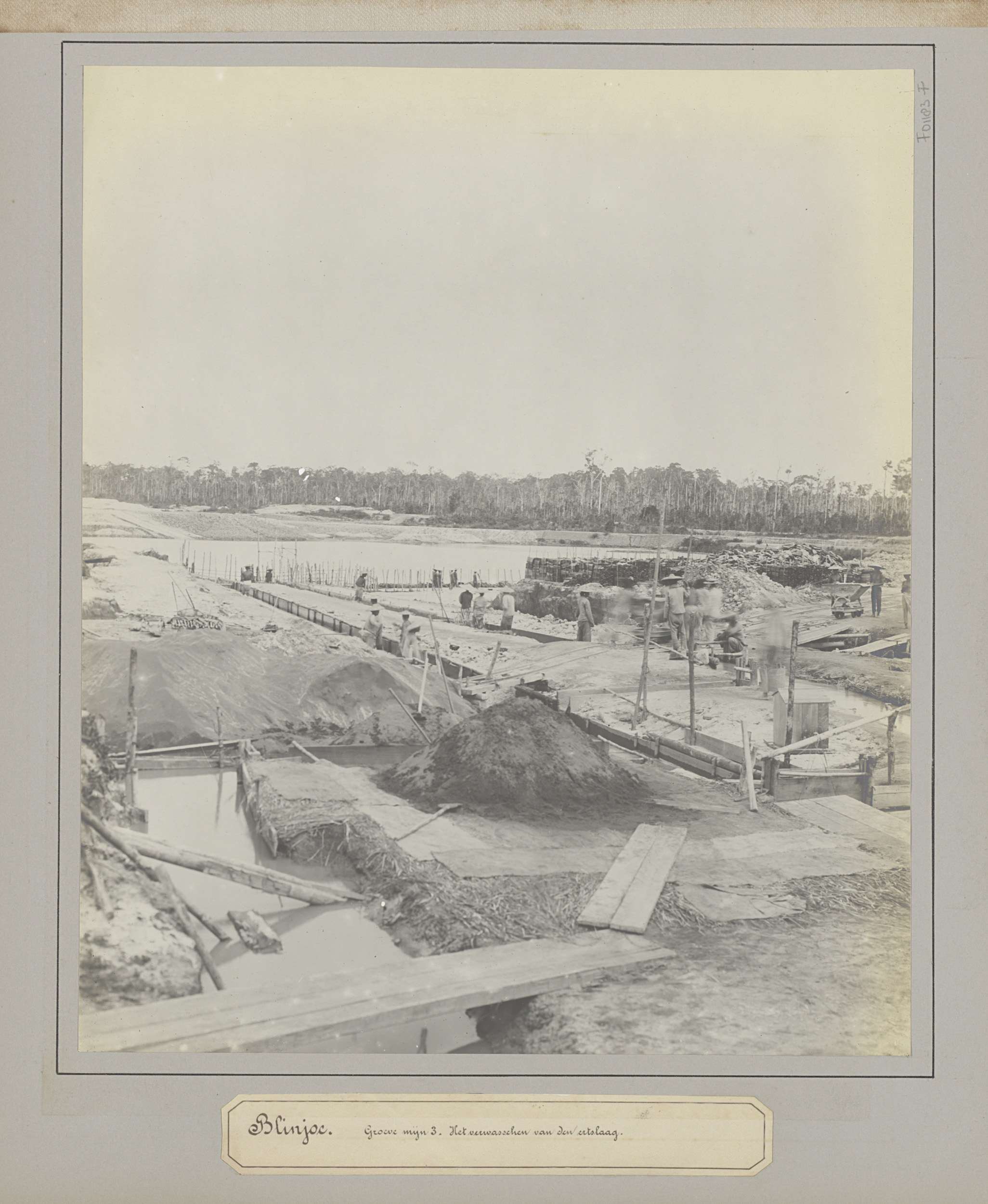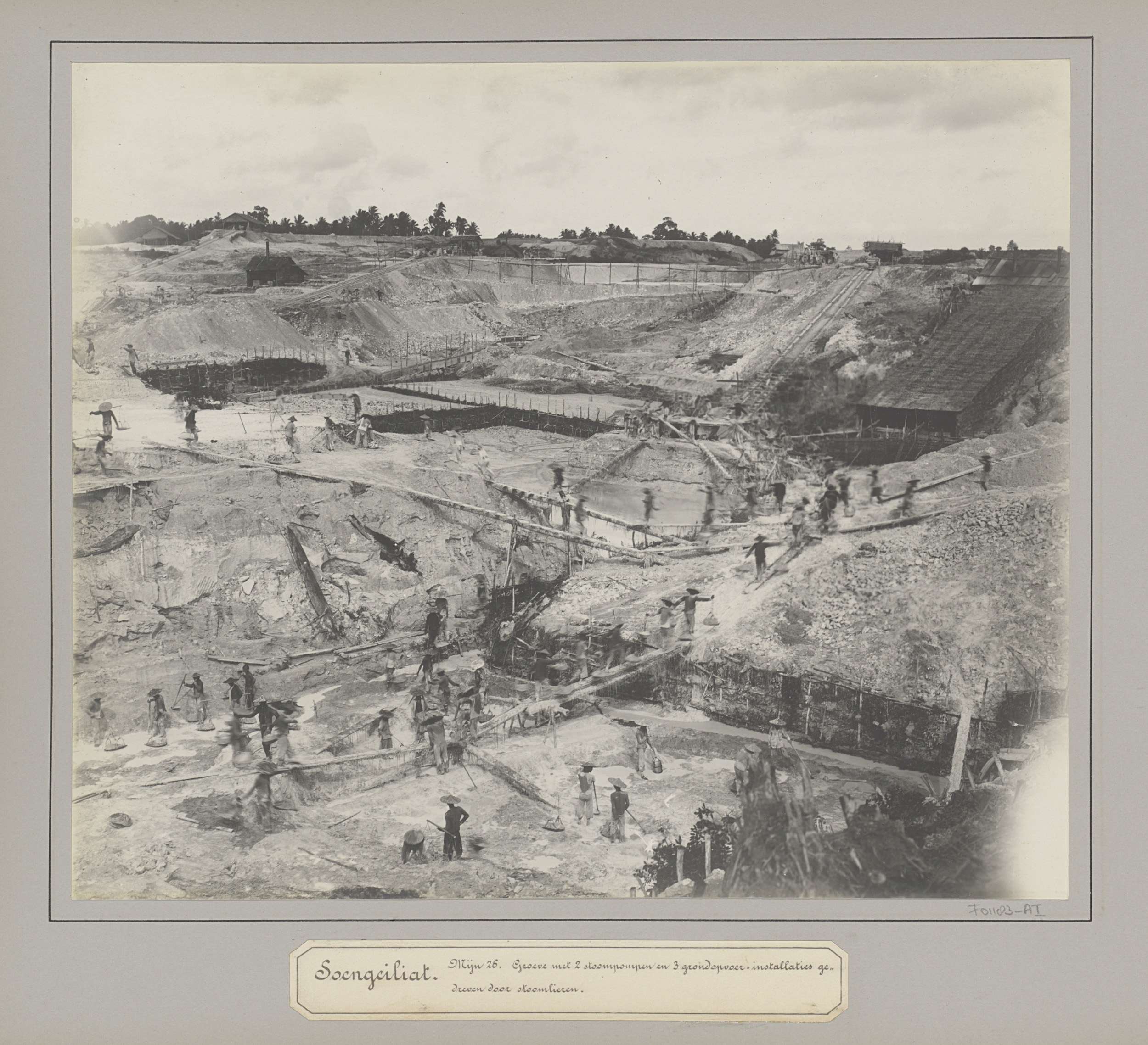Gezicht op een tingroeve met mijnwerkers te Belinyu