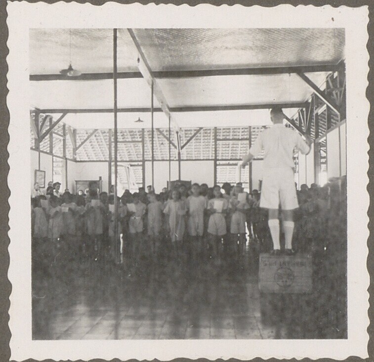 Kinderen in de rij in kindervacantiehuis voor weeski...