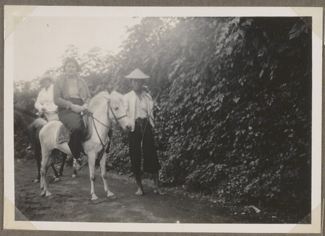 Twee vrouwen op pony's met Javanen ernaast in Sarang...