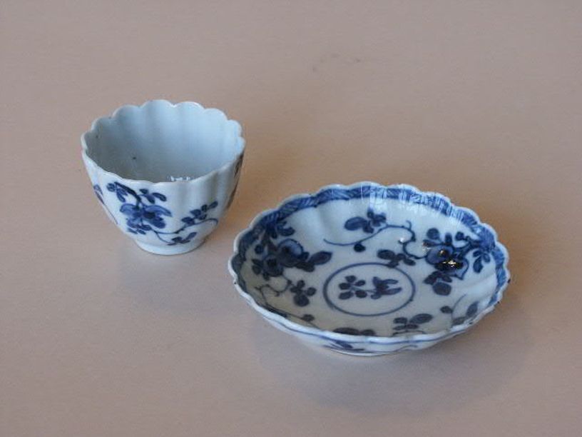 6 koppen en 7 schotels met decor van bloemtakken en ...