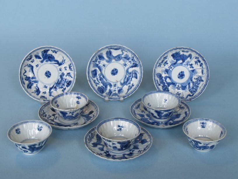 5 Koppen en 6 schotels met decor van tijger, qilin e...