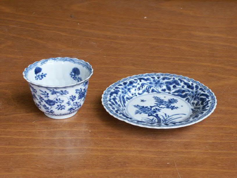 6 kop en schotels met decor van takken, vruchten en ...